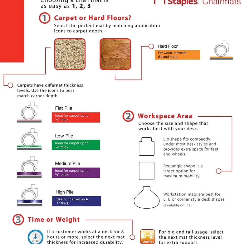 | Chair Mat Size Carpet Pile refers to the height (or depth) of the carpet. Chair mats are usually built with cleats on the bottom, which come in different lengths. The higher the carpet pile, the longer the cleats you’ll need for the chair mat. | Low Pile: (Up to 3/8″) |