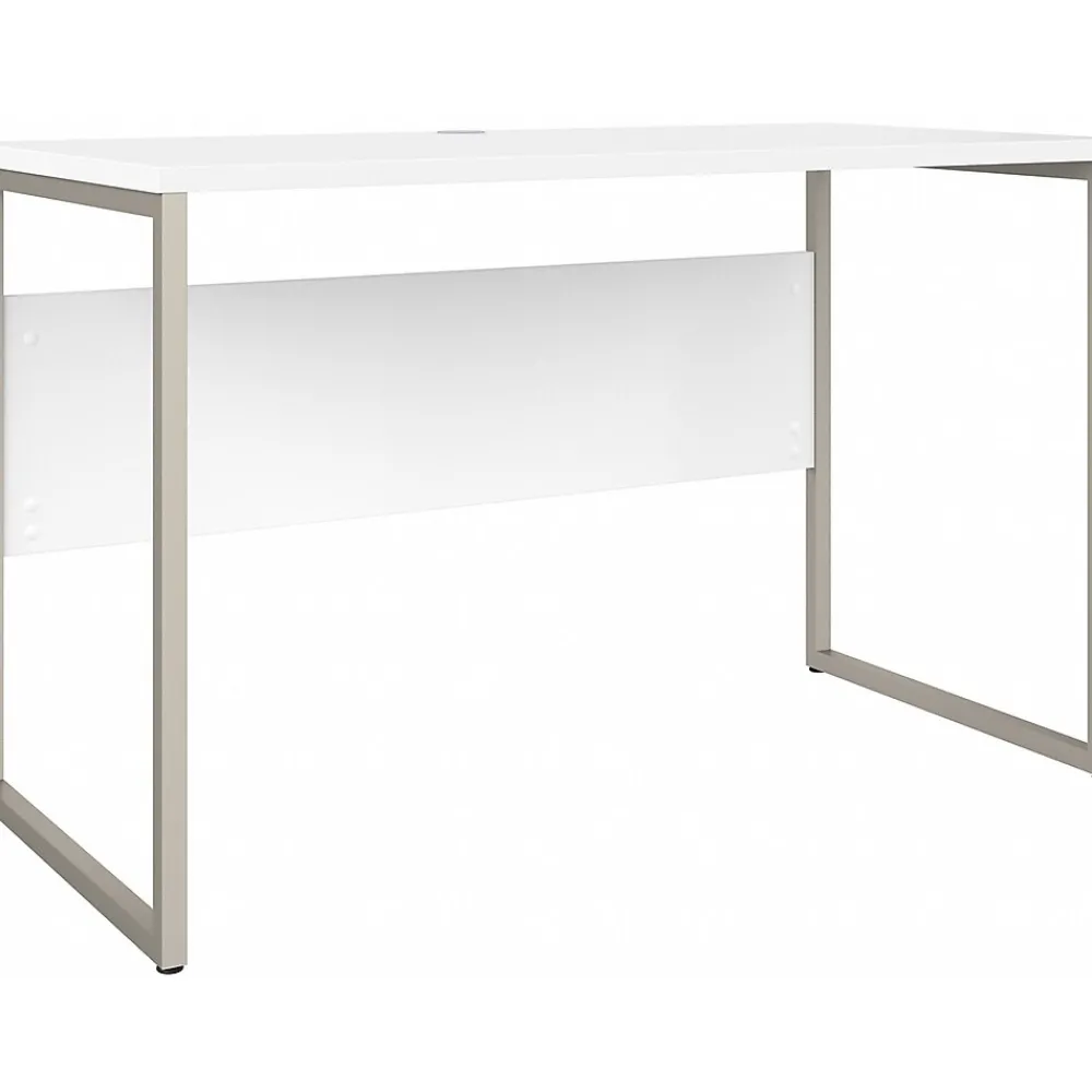 The Bush Business Furniture Hybrid 48″W x 24″D computer table desk blends a durable work surface with sturdy metal legs to offer a stylish, long-lasting solution for the modern professional. Tackle your next project or assignment with a computer, books, paperwork, and more on a desktop that supports up to 200 lbs. A built-in wire management grommet keeps cords and cables in order, so your work area remains free from unnecessary clutter. The computer desk’s open leg design and finished privacy panel allow it to look great facing any direction in a home or professional office environment. Find the perfect look for your space with five contemporary finish options: black walnut, modern hickory, platinum gray, storm gray, and white. This modern desk has been meticulously tested to meet or exceed ANSI/BIFMA quality standards for safety, durability, and performance and is backed by the Bush Business Furniture 10-year manufacturer warranty. See the full Hybrid collection for coordinating items to enhance your workspace as needed, including file cabinets, bookcases, and storage cabinets (coordinating items sold separately). American-made with US and imported parts.