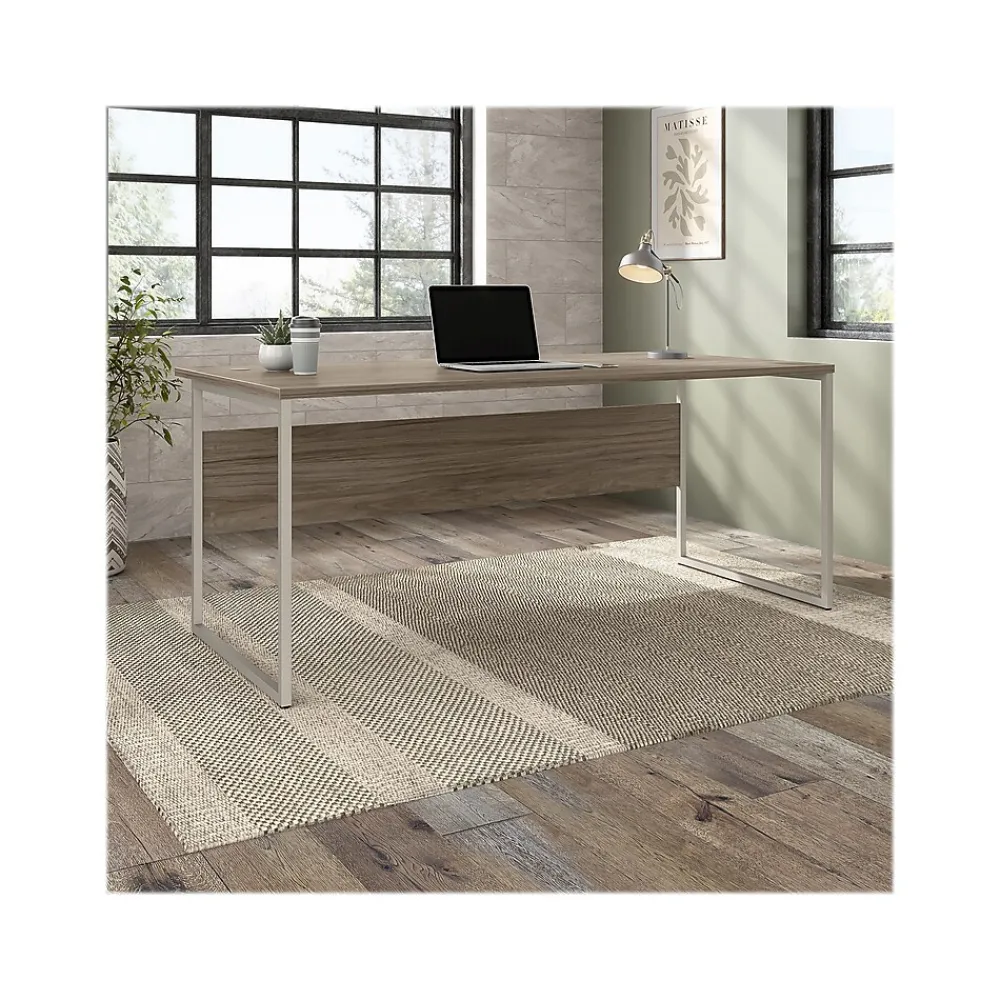 The Bush Business Furniture Hybrid 72″W x 36″D computer table desk blends a durable work surface with sturdy metal legs to offer a stylish, long-lasting solution for the modern professional. Tackle your next project or assignment with a computer, books, and more on a desktop that supports up to 200 lbs. Three built-in wire management grommets keep cords and cables in order, so your work area remains free from unnecessary clutter. The computer desk’s open leg design and finished privacy panel allow it to look great facing any direction in a home or professional office. Find the perfect look for your space with five finish options: black walnut, modern hickory, platinum gray, storm gray, and white. This modern desk has been meticulously tested to meet or exceed ANSI/BIFMA quality standards for safety, durability, and performance and is backed by the Bush Business Furniture 10-year manufacturer warranty. See the full Hybrid collection for coordinating items to enhance your workspace as needed, including bookcases, lateral file cabinets, and storage cabinets (coordinating items sold separately). American-made with US and imported parts.