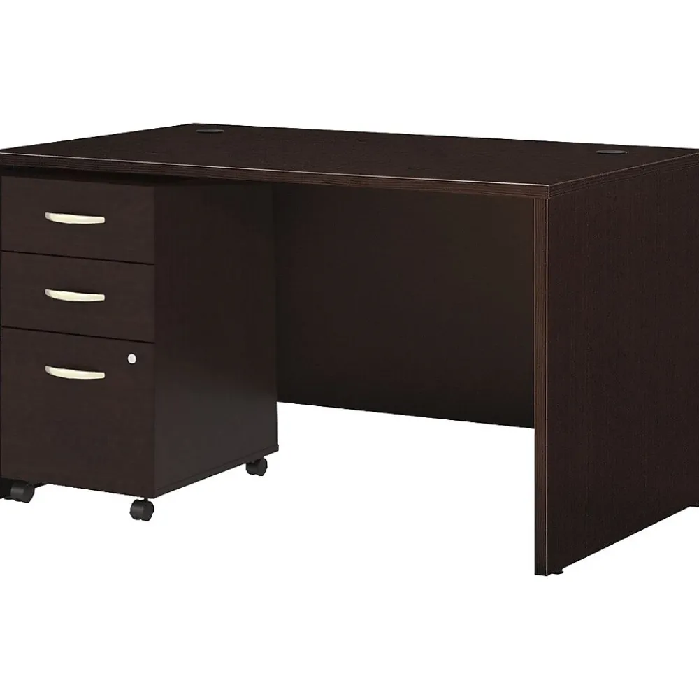 The Bush Westfield desk in mocha cherry is an excellent addition to a home or professional office environment. The desk has a thermally fused laminate surface, which is scratch and stain resistant, and a three drawer mobile pedestal. The pedestal includes two box drawers and one file drawer. The Bush Westfield desk has technology-friendly desktop grommets which allow you to easily set up phones or computers. The desk is also American made and GSA approved.