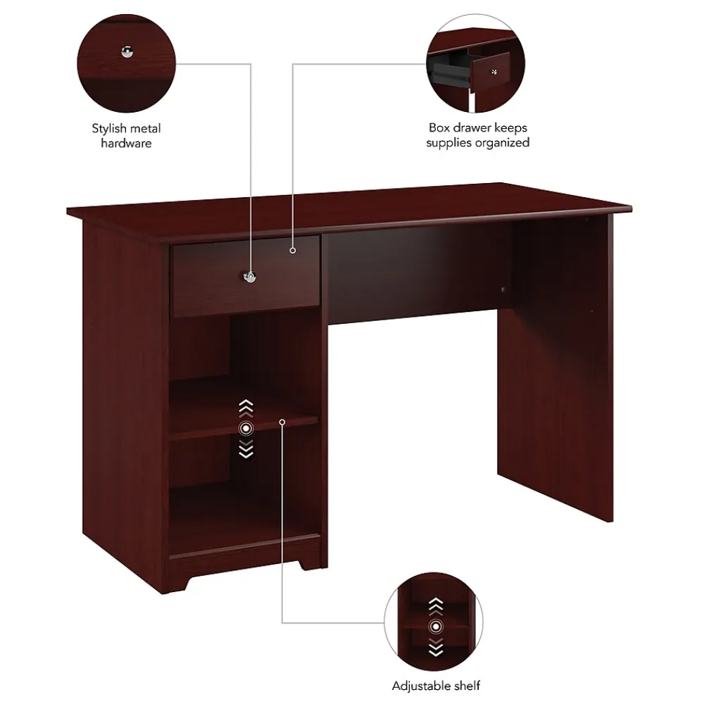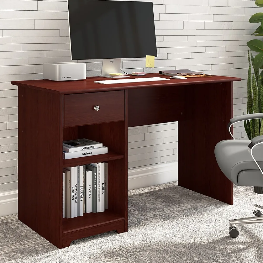 The Bush Furniture Cabot 48W Computer Desk with Storage presents a convenient solution for your home office with transitional style. The compact work surface is perfect for small spaces while still offering plenty of room to complete assignments. Take advantage of the durable desktop to spread out while taking on your daily tasks. A box drawer allows you to organize writing utensils and small office supplies. The open compartments are perfect to store frequently used materials and office equipment. The computer desk is finished on all sides to look great facing any direction. Stylish metal hardware complements your choice of finish for an appearance that works with your own space and taste. This desk with storage has been rigorously tested to meet or exceed ANSI/SOHO quality standards for safety and performance and is backed by the Bush Furniture 1 Year Manufacturer’s Warranty.