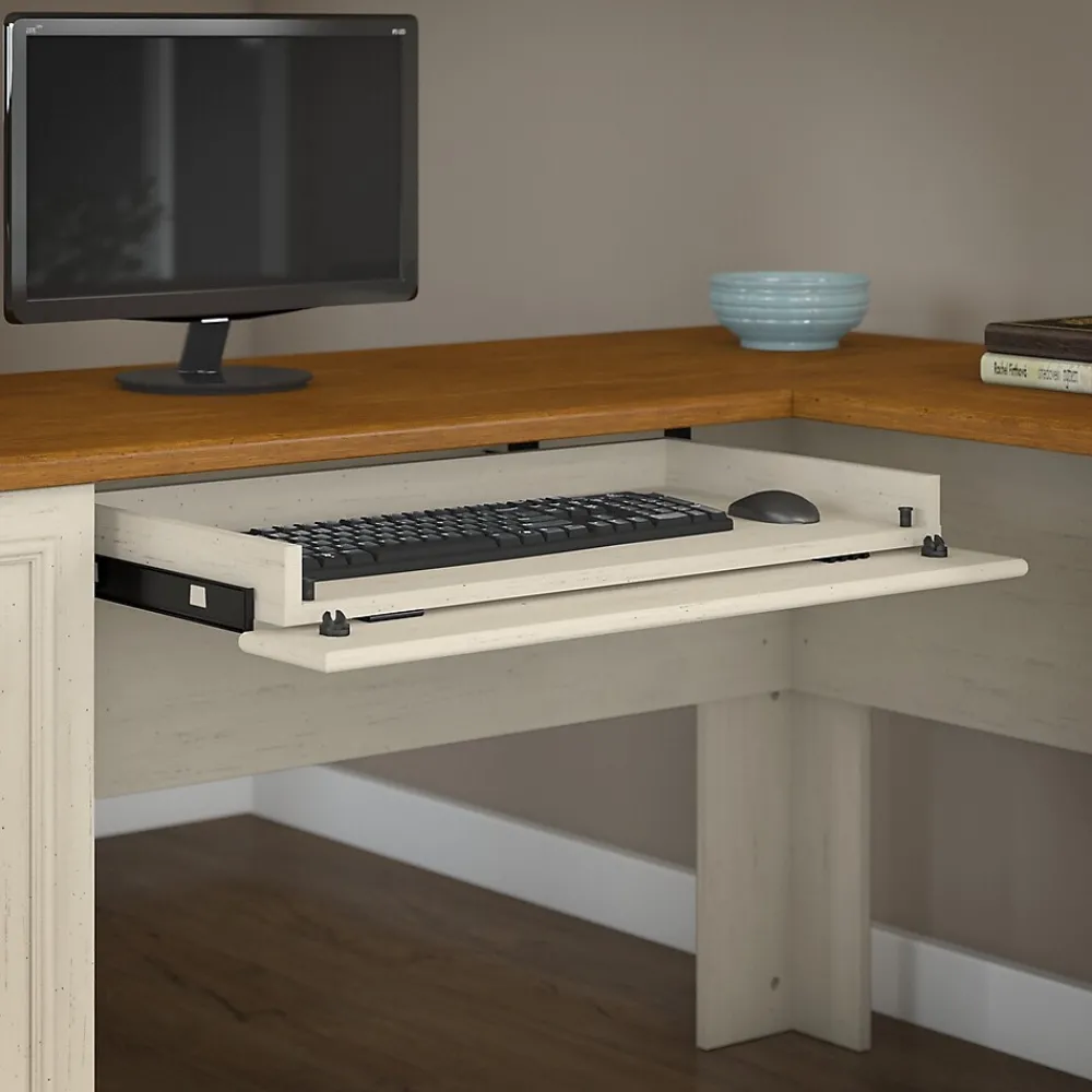 Bring a slice of modern farmhouse styling into your home office with the Bush Furniture Fairview L Shaped Desk. Spread out, surf the net and pay bills on the durable surface, and stash supplies in the box drawer or open storage space. Organize mail in the letter-size file drawer or vertical closed storage area, and store your laptop or keyboard in a drawer with a drop-down front. Antique Pewter hardware adds character to your home office. Attach the Hutch (sold separately) to either side of the L Shaped Desk to fit your needs. Available in attractive Antique Black with Hansen Cherry accents or Antique White with Tea Maple accents, Fairview meets ANSI/SOHO quality test standards for performance and safety, and comes with a 6 Year Manufacturer’s Warranty. See the full collection for coordinating items available, including the Hutch.