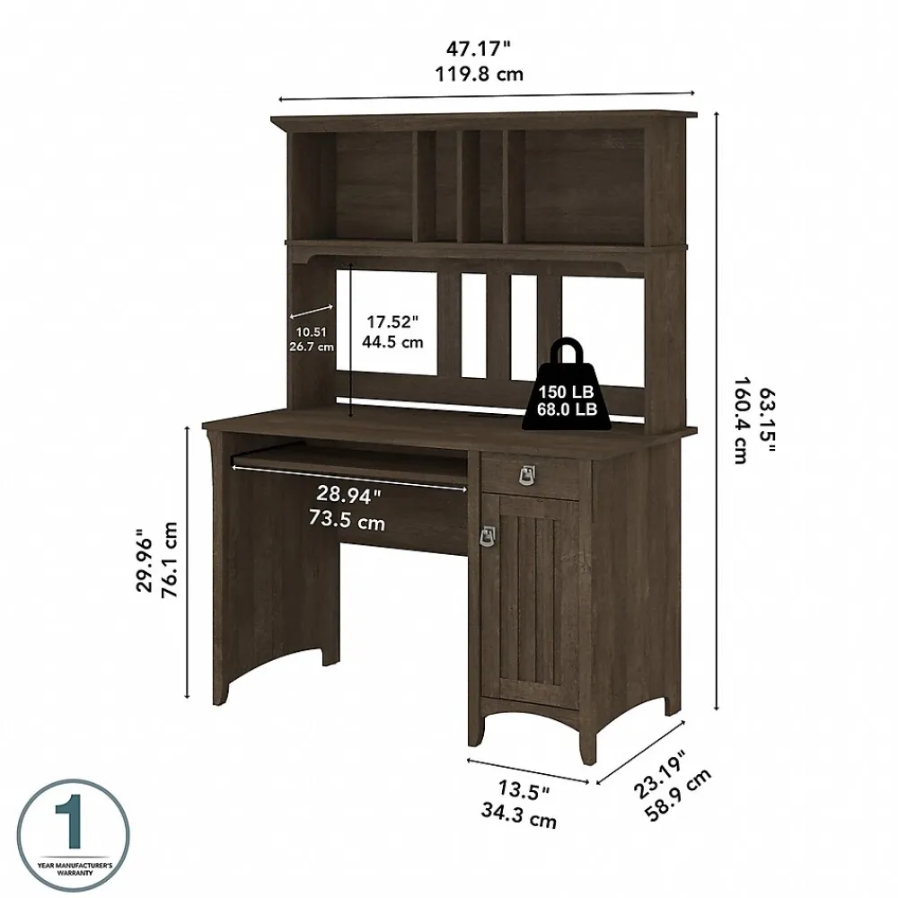 The Bush Furniture Salinas small computer desk with hutch takes timeless Mission styling and adds plenty of modern touches to help you complete your daily tasks. Technology-ready features include a pullout keyboard tray or laptop shelf and a work surface with a built-in wire management system to keep cords and cables in order. The hutch has plenty of storage space for work in progress, books, decorations, and more while the 48″W desk features a vertical cabinet with one adjustable shelf along with a box drawer to organize office supplies and writing utensils. This computer desk is perfect for small spaces. The compact design boasts a sturdy construction with clean lines, tapered legs, and attractive wood detailing. The durable desktop supports up to 150 lbs. and offers ample space to complete projects and assignments, pay bills, or surf the web. This home office desk set is backed by a 1-year warranty.