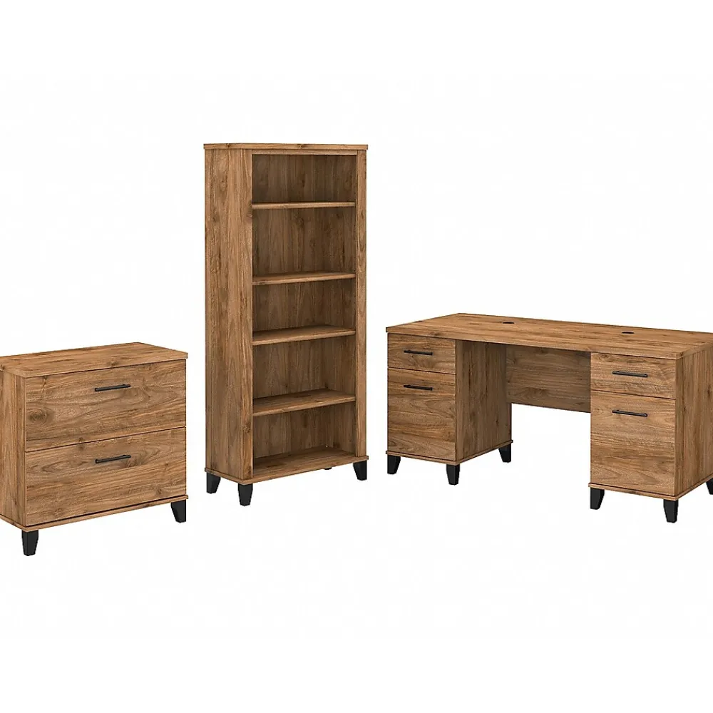 Add a touch of professional style to your workspace with the Bush Furniture Somerset 60″ office desk with lateral file cabinet and five-shelf bookcase. The spacious 60″ surface with wire management slots provides plenty of room to spread out with a computer, paperwork, and more. Two file drawers and a pair of box drawers easily accommodate supplies and documents. The file cabinet opens on smooth ball bearing slides for an easy reach to legal-, letter-, and A4-size paperwork. Two of the bookcase’s shelves are fixed for stability and three are adjustable to ensure that items of all sizes have their place. Transitional styling includes your choice of attractive finishes with tapered leg accents and contemporary metal hardware. This home office furniture set is tested to meet ANSI/SOHO quality standards for safety and performance and is backed by the Bush Furniture 6-year manufacturer’s warranty.