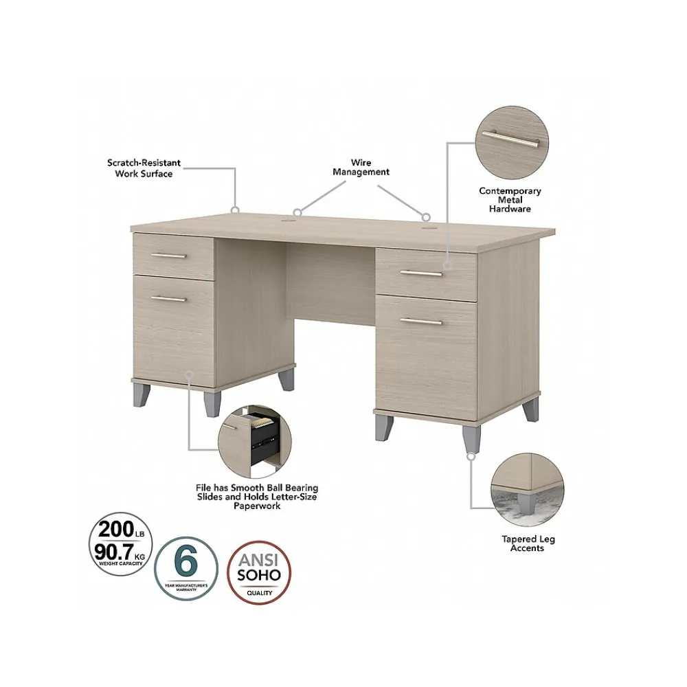 Add a touch of professional style to your workspace with the Bush Furniture Somerset 60″W office desk with lateral file cabinet and five-shelf bookcase. The spacious 60″ surface with wire management provides plenty of room to spread out with a computer, paperwork, and more. Two file drawers and a pair of box drawers easily accommodate supplies and documents. The file cabinet opens on smooth ball bearing slides for an easy reach to legal-, letter-, and A4-size paperwork. Two of the bookcase’s shelves are fixed for stability and three are adjustable to ensure that items of all sizes have their place. Transitional styling includes your choice of attractive finishes with tapered leg accents and contemporary metal hardware. This home office furniture set is tested to meet ANSI/SOHO quality standards for safety and performance and is backed by the Bush Furniture 6-year manufacturer limited warranty.