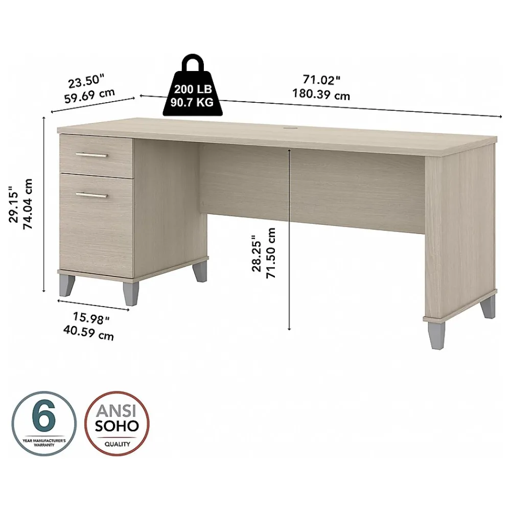 An expansive work surface and built-in storage make the Bush Furniture Somerset 72″W computer desk with drawers a perfect choice for your home office. The spacious desktop offers plenty of room to spread out with a computer and paperwork and includes a wire management grommet to keep cords and cables secure and out of sight. The desk’s file drawer opens on full-extension ball bearing slides for easy access to legal- and letter-size documents, while a box drawer keeps the office supplies and utensils you need close by. A finished back side allows the desk to look great no matter where it’s positioned in the room. The computer desk can also be used with the Somerset 42″W three-position sit to stand return (sold separately) to create an ergonomic height-adjustable workspace. The desk with drawers meets or exceeds ANSI/SOHO standards for safety and performance and is backed by a 6-year manufacturer limited warranty.