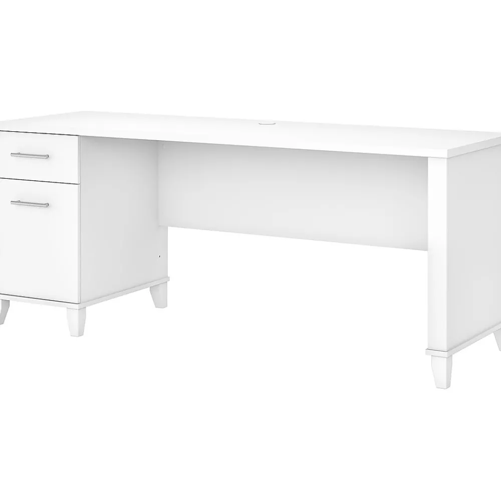 An expansive work surface and built-in storage make the Bush Furniture Somerset office desk with drawers a perfect choice for your home office. The spacious desktop offers plenty of room to spread out with a computer and paperwork and includes a wire management grommet to keep cords and cables secure and out of sight. The desk’s file drawer opens on full-extension ball bearing slides for easy access to legal- and letter-size documents, while a box drawer keeps the office supplies and utensils you need close by. A finished back side allows the desk to look great no matter where it’s positioned in the room. The office desk with drawers meets or exceeds ANSI/SOHO standards for safety and performance and is backed by a 6-year manufacturer limited warranty.