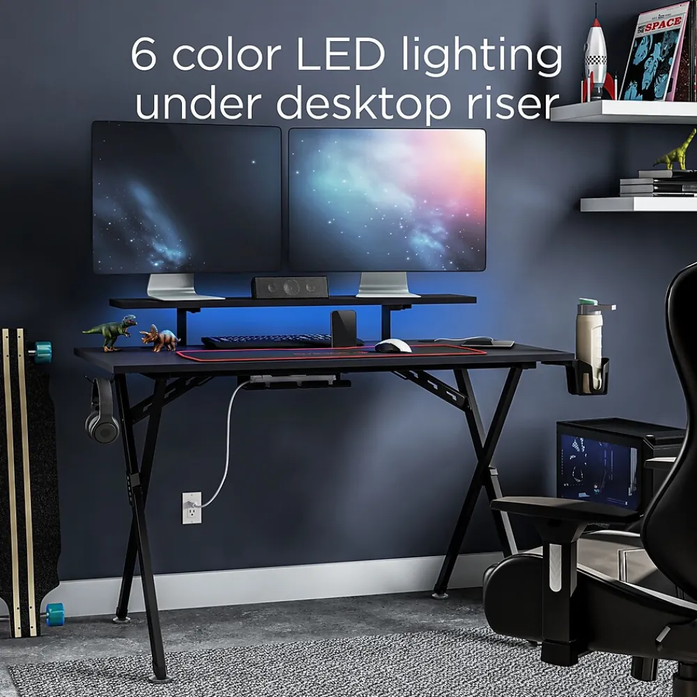 - Raised monitor platform and 6 color LED lighting strip