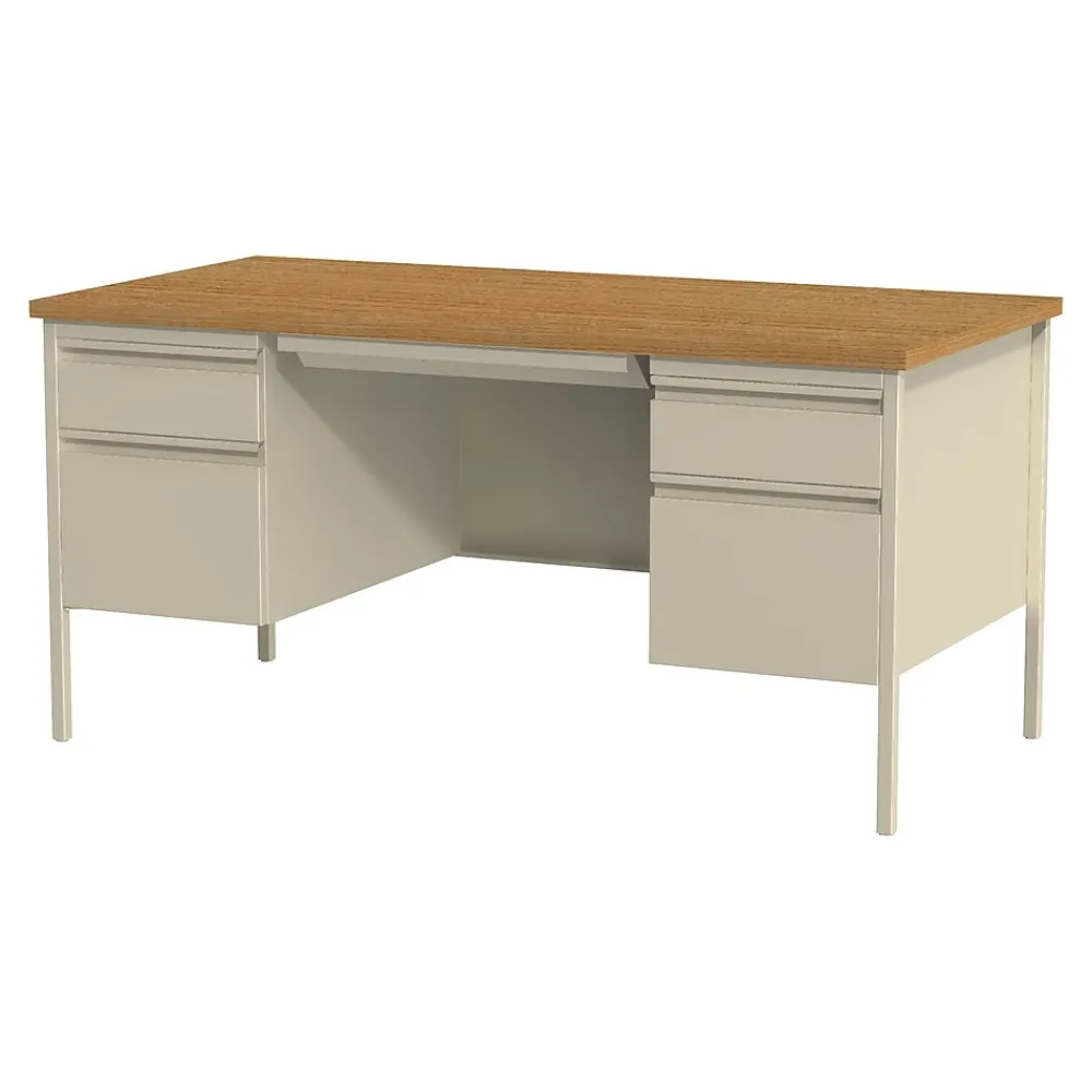 - Modern-style desk is constructed of high-quality steel in a putty finish with laminate work surface in an oak finish