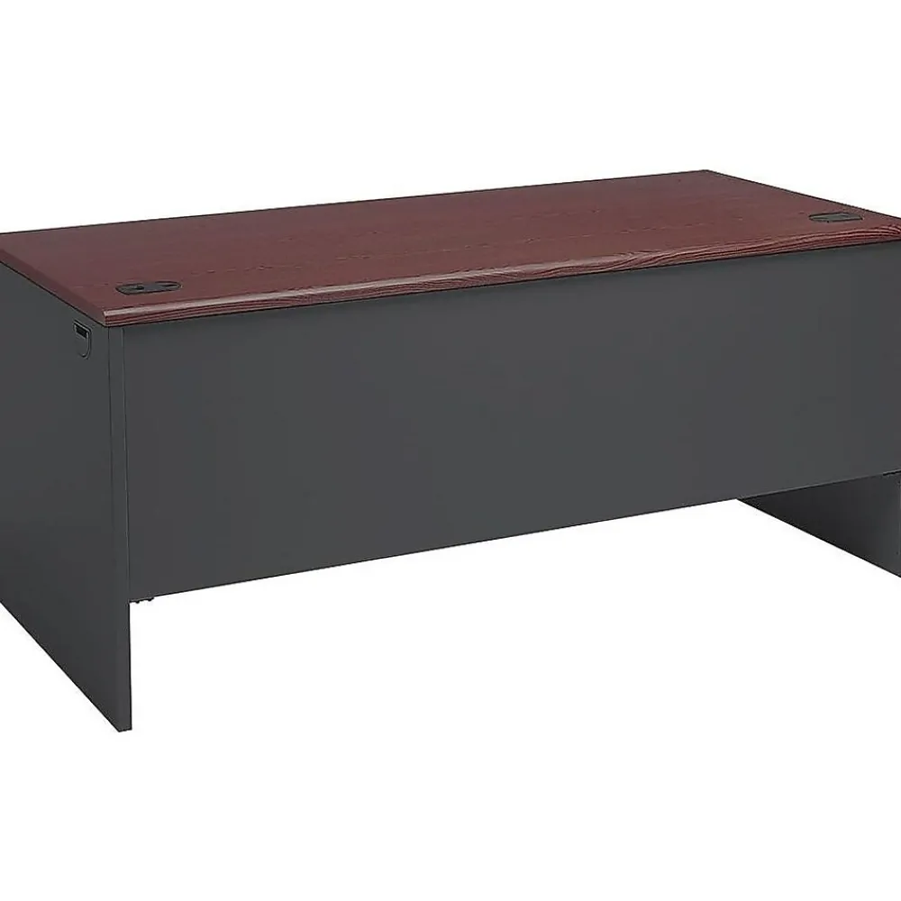 Give your office or cubicle a modern look with this HON 38000 Series left-pedestal desk in mahogany and charcoal. The high-pressure laminate top stands up to coffee spills, scratches and dings, and a waterfall edge provides added comfort for long days spent typing emails and reports. Durable steel construction makes this desk ideal for busy offices, giving you a durable, long-lasting workstation. With Tru-Fit fronts, each drawer closes with precision for a clean, professional appearance. A wire management system keeps cords and cables under control, preventing tangles and messes behind your office electronics. The spacious work surface accommodates a CPU tower, monitor, phone and other desk essentials, and the open design underneath offers ample legroom for stretching in between tasks. Use the file drawer to sort forms, reports and client documents, and put the box drawer to work as your office supply storage space. With a built-in modesty panel, this HON 38000 Series left-pedestal desk keeps bags and briefcases neatly out of sight.