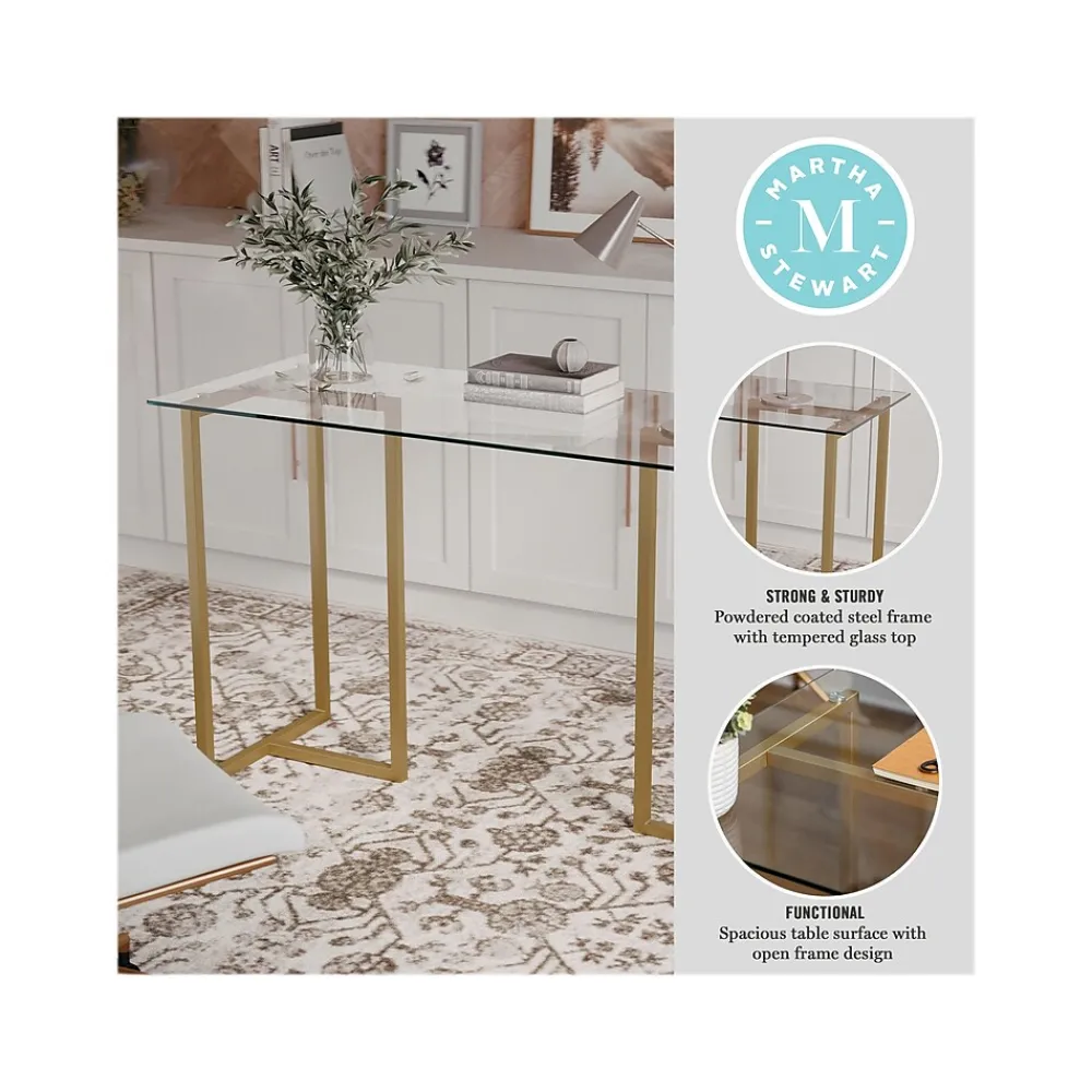 When creating your home office space, start with the focal point, your desk, which should be everything that you need to make your workday go smoother. This modern Martha Stewart Eli home office desk in a spacious open-frame design has an easy-to-clean tempered glass desktop with a powder-coated steel frame base in a polished brass finish.