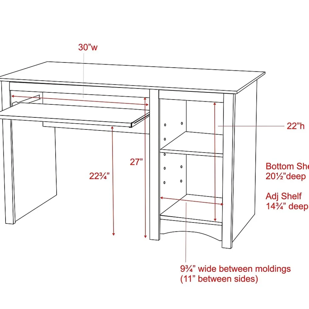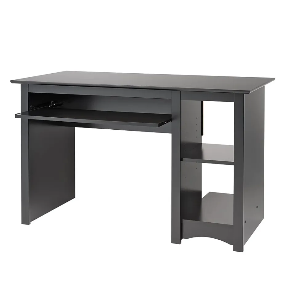 The Prepac Computer Desk offers storage and desktop space with a small footprint. The pullout tray saves space on the desktop while providing convenient access to devices like a keyboard and mouse. Designed to be positioned against a wall, the desk is constructed from real wood and black-laminated finish to complement almost any decor. The right-side shelves offer adjustable storage.