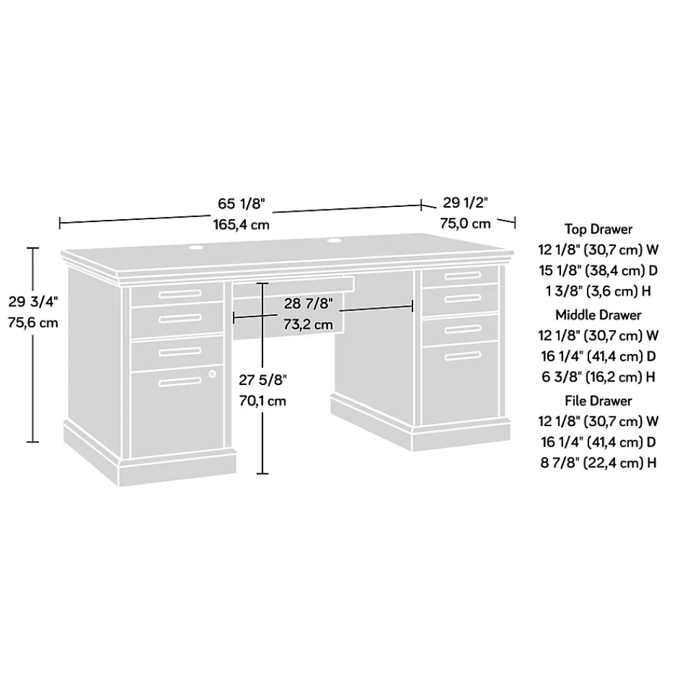 An essential addition to the home is a convenient and functional workspace. With the executive desk from the Aspen Post collection, style and function are combined into one awesome desk. The top of this double pedestal desk features strong and lightweight 1 panel construction. This computer desk with drawers features two smaller pencil drawers and two medium size standard drawers to hold paper clips, pens, notebooks, calculator, and other office supplies. Two lower file drawers with full extension slides hold letter, legal or European size hanging files so your most important documents are organized and close at hand. The left file drawer features a key lock for security. This executive desk with storage features a cord management system with two desk top grommet holes, helping to keep your cords tidy and clutter-free. To enhance your home office, this desk also accommodates optional Hidden Wireless Qi Charger by Eggtronics 425905 (sold separatelyvisit sauder.com for more information). It features quick and easy assembly with a T-lock drawer system, saving time for assembly and set up of this executive pedestal desk. Finished in a distressed Pebble Pine, this executive desk adds a dignified look with robust function to any home office.
