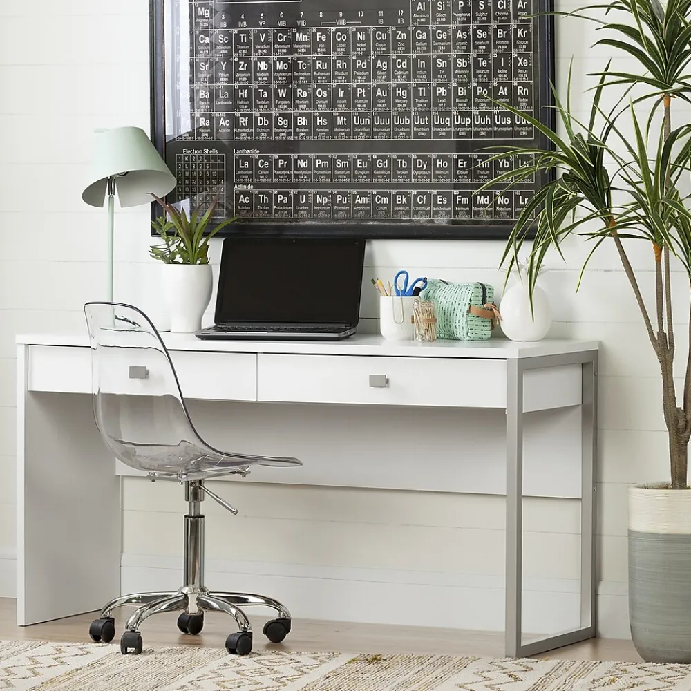 This elegant desk from the Interface collection will satisfy the biggest fans of contemporary style. It features an attractive metal leg and gives you a large workspace as well as two storage drawers for your pencils, calculators, and other accessories.