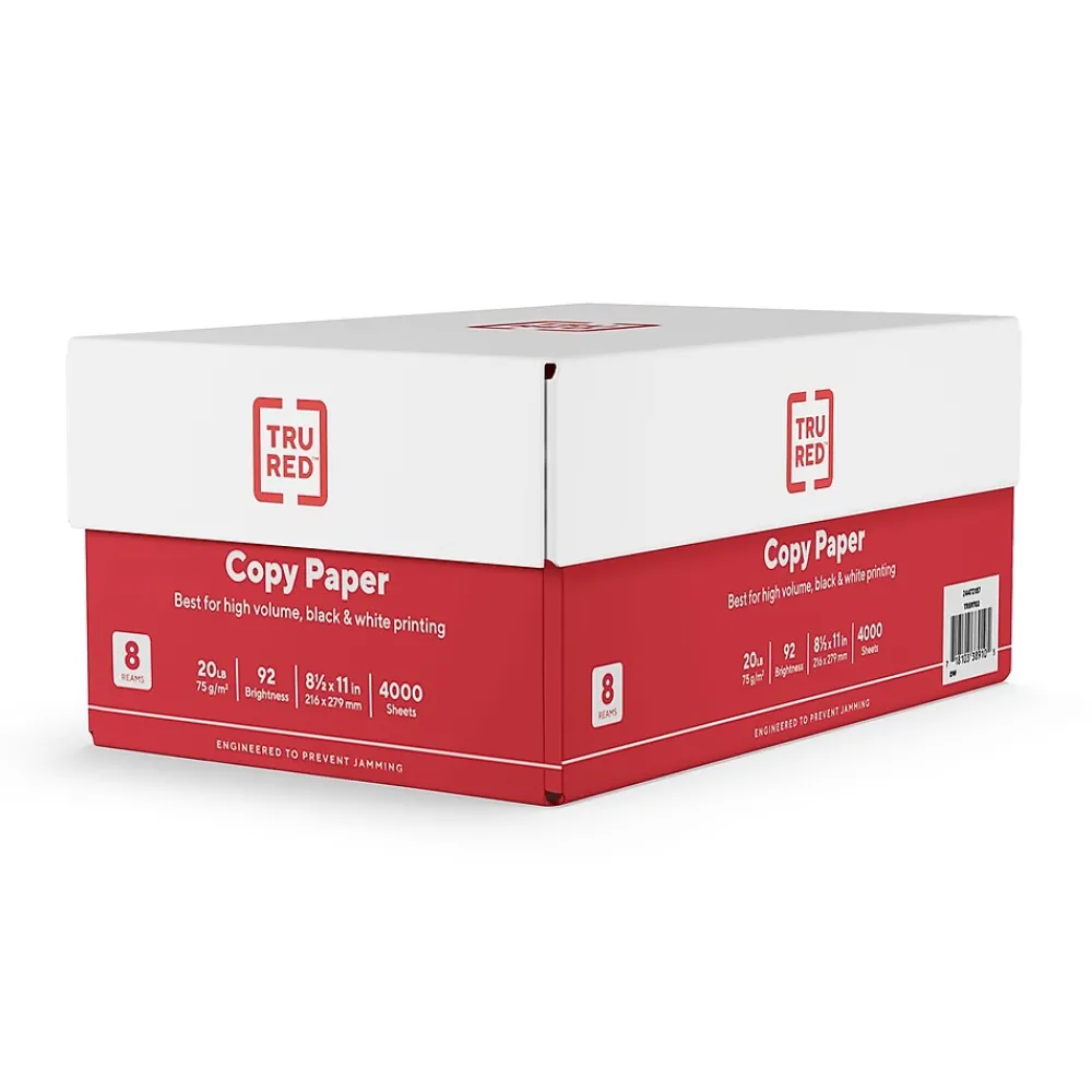 Deliver high-quality results on documents with this copy paper. Compatibility with most machines offers effortless loading, while the 20-pound weight resists jamming in laser and inkjet printers. With a 92 brightness rating, this paper delivers crisp text and images in black and white. This TRU RED 8.5 x 11-inch white copy paper provides 4000 sheets to keep up with daily demands.