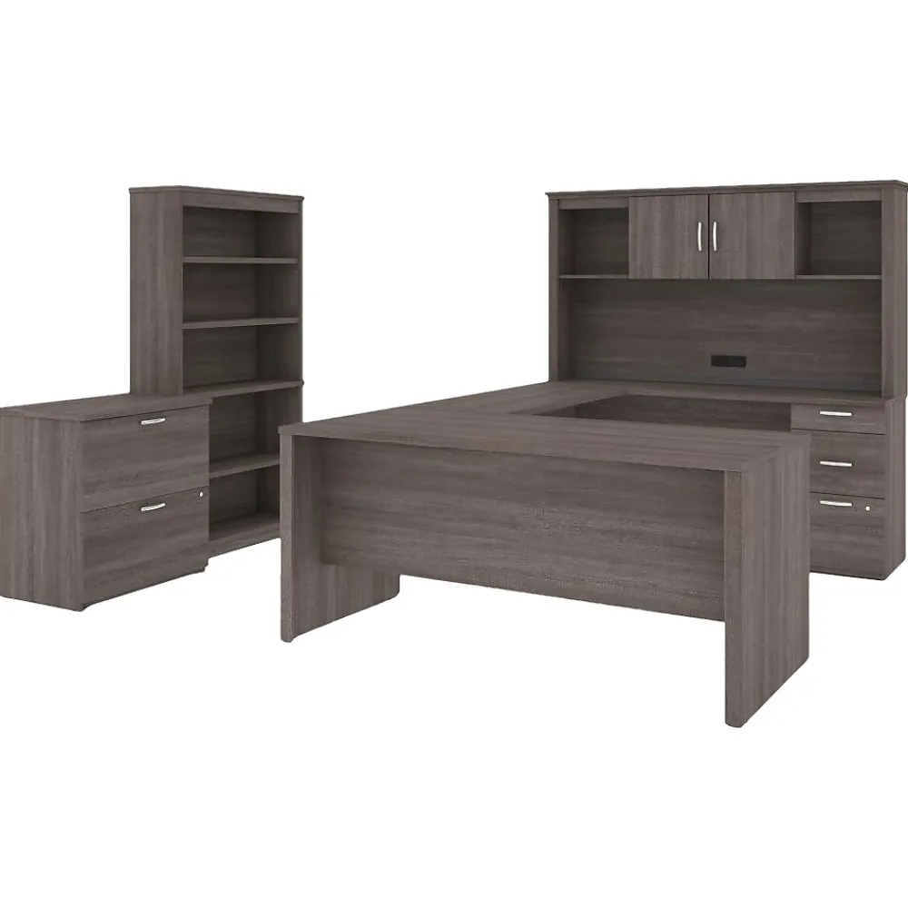 - U-shaped computer desk with hutch, lateral file cabinet, and bookcase allows you to organize your office space the way you like