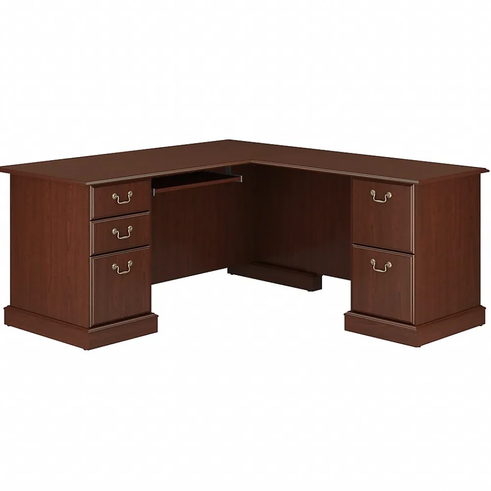 The Bush Furniture Saratoga L Shaped Computer Desk offers luxurious looks at a lasting value. Pen letters, pay bills or outfit your professional-grade home or private office with a traditional L Shaped Desk built for everyday use. The thermally fused laminate surface lasts for years while resisting scratches and stains to protect the warm Harvest Cherry finish. Enjoy all the workspace you need to multitask on the L Shaped Desk, which can be assembled for left or right-handed users. Gold-finished Brass hardware and timeless design accents match the traditional styling of your home office or workspace. Not just for looks, the Computer Desk includes a wide retracting keyboard shelf and three full-extension file drawers, which open on smooth ball-bearing slides. Two box drawers hold office supplies. Backed by a 10 Year Warranty, Saratoga meets ANSI/BIFMA performance and safety standards.
