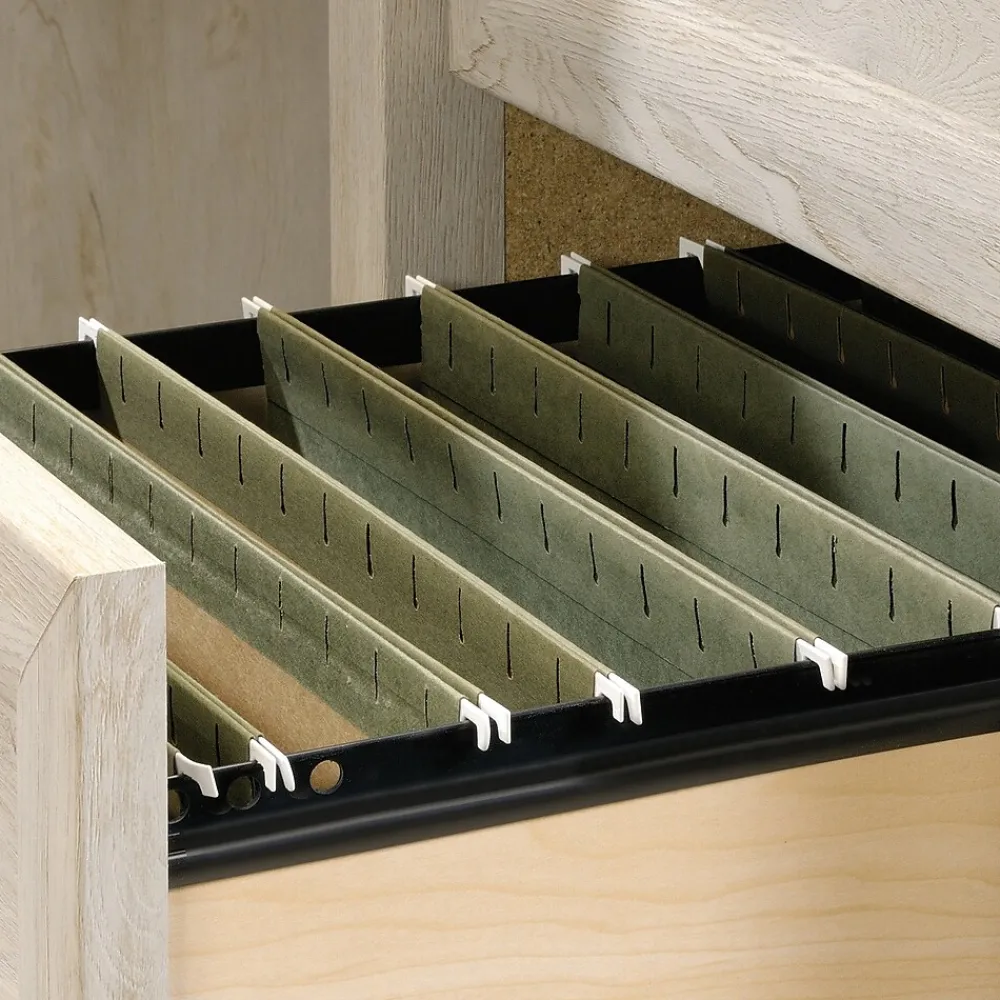 - Two file drawers with full extension slides hold letter-size hanging files.