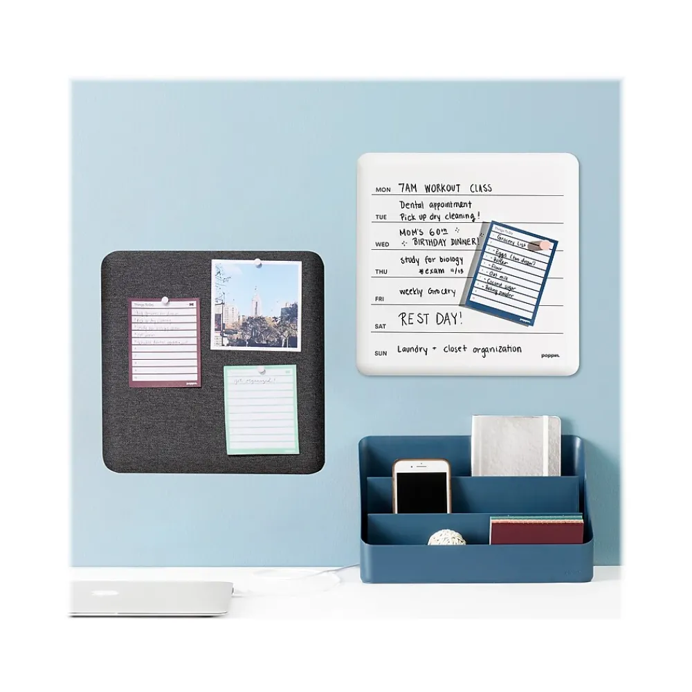 Put your week up on the wall with the Poppin magnetic weekly dry-erase board. Printed with a handy weekly layout, the board is perfect for meal planning, sharing family calendars, and looking forward to Friday. The preprinted weekly layout helps you keep it all together. Includes removable adhesive strips, magnets, and screws for mounting.