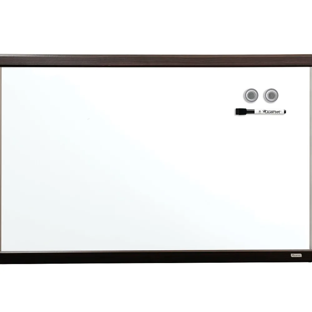 Quartet Magnetic dry-erase board with mahogany finish and aluminum frame measures 2′ x 3′ and is ideal for home office, cubicles or small spaces. Whiteboard quickly secures documents with the included quick clips.