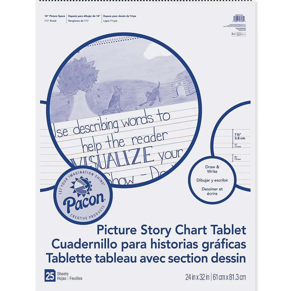 Pacon Chart Tablets work great for classroom anchor charts. Designed to assist in classroom demonstration, this chart tablet can be used to help reinforce lessons being taught, and can also serve as a reference tool to help children with problem solving. This chart tablet is 1.5″ ruled with a 0.75″ dotted midline and 0.5″ skip space and has a 13.625″ picture story area at the top. Recyclable. Measures 24″ x 32″. Each tablet includes 25 sheets. Sold as a pack of 2 tablets.