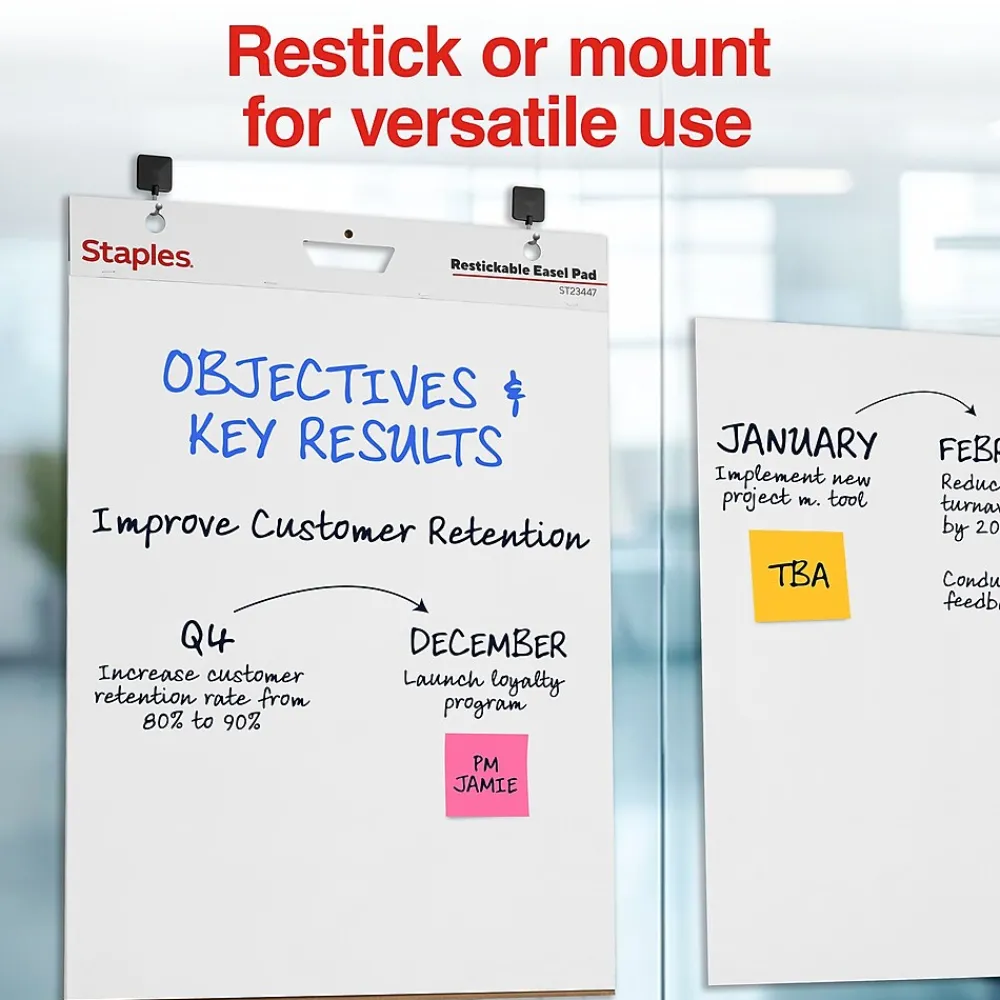 Display the results of meetings, brainstorming sessions, or project-planning sessions with these restickable easel pads. The crisp, white color helps marker stand out for better visibility, while the self-adhesive backings let you post the papers on an office, conference room, or classroom wall. Boasting sturdy construction, these Staples easel pads resist bleed-through to keep each individual page clean and neat.