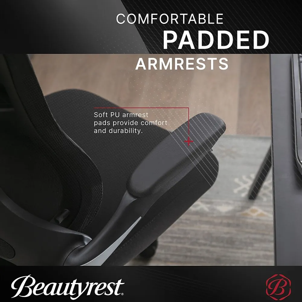 Enjoy the innovative comfort of the Beautyrest ErgoMax mesh office chair. With ergonomic design and exclusive technology, this revolutionary chair allows you to sit down in your morning meeting with ease. ErgoMax lumbar technology matches your seating position with the pull of a lever. Move forward and the ErgoMax seat back meets you at the edge of your seat so you can maintain alignment in your spine. Want to change positions? Lean back and ErgoMax falls into place and stays out of the way, without losing support. And it’s not just functional: the chair’s classic black mesh material is made with superior craftsmanship that’s sure to last without compromising on sleekness and style. Get all the support you need with the Beautyrest ErgoMax mesh office chair.