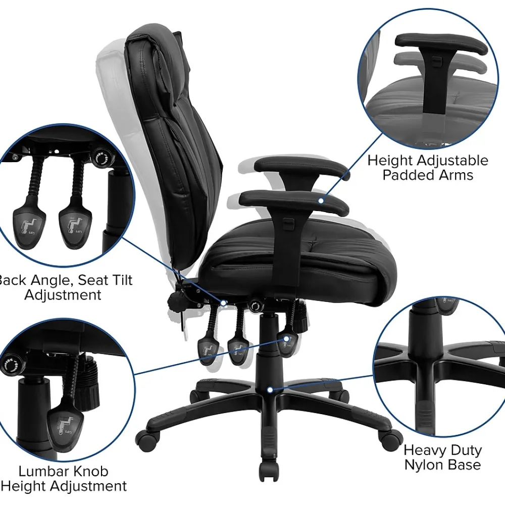 This attractive LeatherSoft office chair is loaded with options to maximize your comfort and productivity. Its high-back, integrated headrest and built-in lumbar support help prevent back strain. You can increase lumbar support using the pressurized lumbar support knob. The padded swivel seat is filled with 3″ of foam and features a waterfall edge. Height adjustable padded armrests take pressure off your shoulders and neck. Easily adjust the seat’s back angle, seat height and tilt angle with three paddle mechanisms conveniently located under the seat. The infinite-locking back angle adjustment helps reduce disc pressure by changing the angle of your torso. Turn the tilt tension adjustment knob to increase or decrease the amount of force needed to rock or recline and lock the seat in place with the multi-tilt lock mechanism. LeatherSoft is leather and polyurethane for added softness and durability. This ergonomic chair is a stylish addition to any workspace.