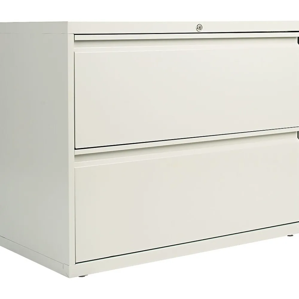 Alera® Two-drawer lateral file cabinet in light gray color features durable powder coated finish that helps to prevent scratches. Cabinet measuring 28 3/8″ x 36″ x 19 1/4″ comes with 4 adjustable leveling glides, single key core removable lock.