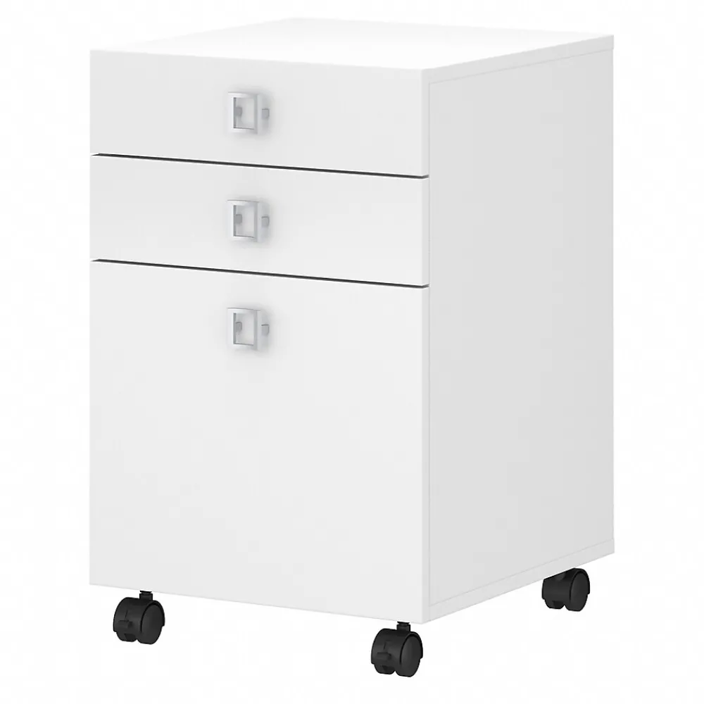 Blend style, flexibility and reliability at work or in your home. The Bush Business Furniture Echo 3 Drawer Mobile File Cabinet combines an elegant Pure White finish with fashionable Satin Silver hardware to inspire your professional best. Give your workspace commercial-grade quality that promotes growth and productivity with convenient, reliable features. The contemporary white Cabinet provides two box drawers to store office supplies with a full-extension file drawer for letter-size paperwork. Drawers glide on smooth ball-bearing slides for a trouble-free open and close, while the Cabinet rolls effortlessly on dual-wheeled hooded casters. A durable, thermally fused laminate finish maintains the beautiful contemporary look for years. From Bush Business Furniture, the Mobile File Cabinet comes with a 3 Year Warranty and meets ANSI/BIFMA quality standards.