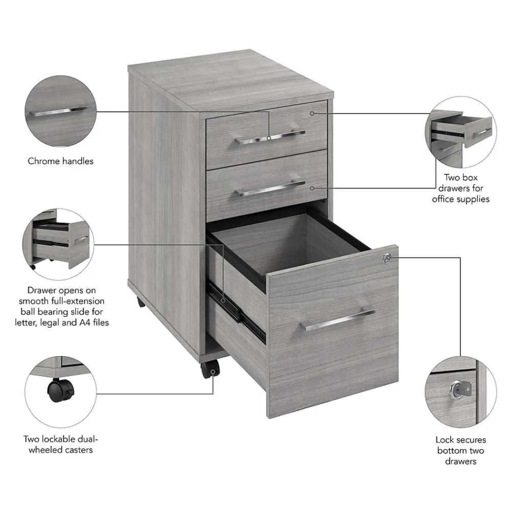 The Bush Business Furniture Hustle 3 Drawer Mobile File Cabinet provides the form and function needed to support your entrepreneurial spirit without breaking the bank. An ideal choice for small to medium-size businesses and home offices alike, the small filing cabinet rolls effortlessly throughout your workspace to provide storage where it’s needed most. The bottom drawer opens on smooth full-extension ball bearing slides for easy access to letter, legal, and A4-size paperwork while two box drawers organize writing utensils and other small office supplies. Drawers can be locked to safeguard sensitive documents as well as valuable items. This 3 drawer file cabinet with wheels has been meticulously designed and tested to meet or exceed ANSI/BIFMA standards for safety, durability, and performance and is backed by a 10 Year Manufacturer’s Warranty. American made with U.S. and imported parts.