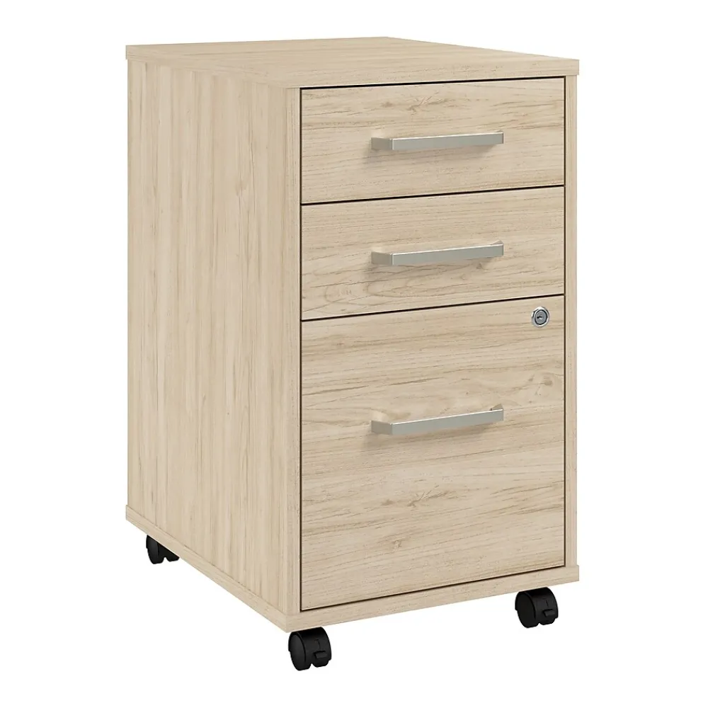 The Bush Business Furniture Vista 3 Drawer Mobile File Cabinet keeps any office or workspace organized and clutter-free, adding a modern touch and extra storage where it’s needed. It features one file drawer for legal, letter, and A4-size paperwork and two box drawers for small office supplies. The drawers open smoothly on full-extension ball bearing slides. The cabinet has a single lock that secures the two bottom drawers for added security. Dual-wheeled casters provide mobility, and the unit fits neatly under coordinating Vista desks. Available in several contemporary finishes paired with attractive brushed nickel hardware. Bush Business Furniture’s commitment to safety includes rigorous testing that meets or exceeds ANSI/BIFMA x5.5 commercial test standards. Backed by a 10 Year Manufacturer’s Warranty and made in North America with globally sourced materials.