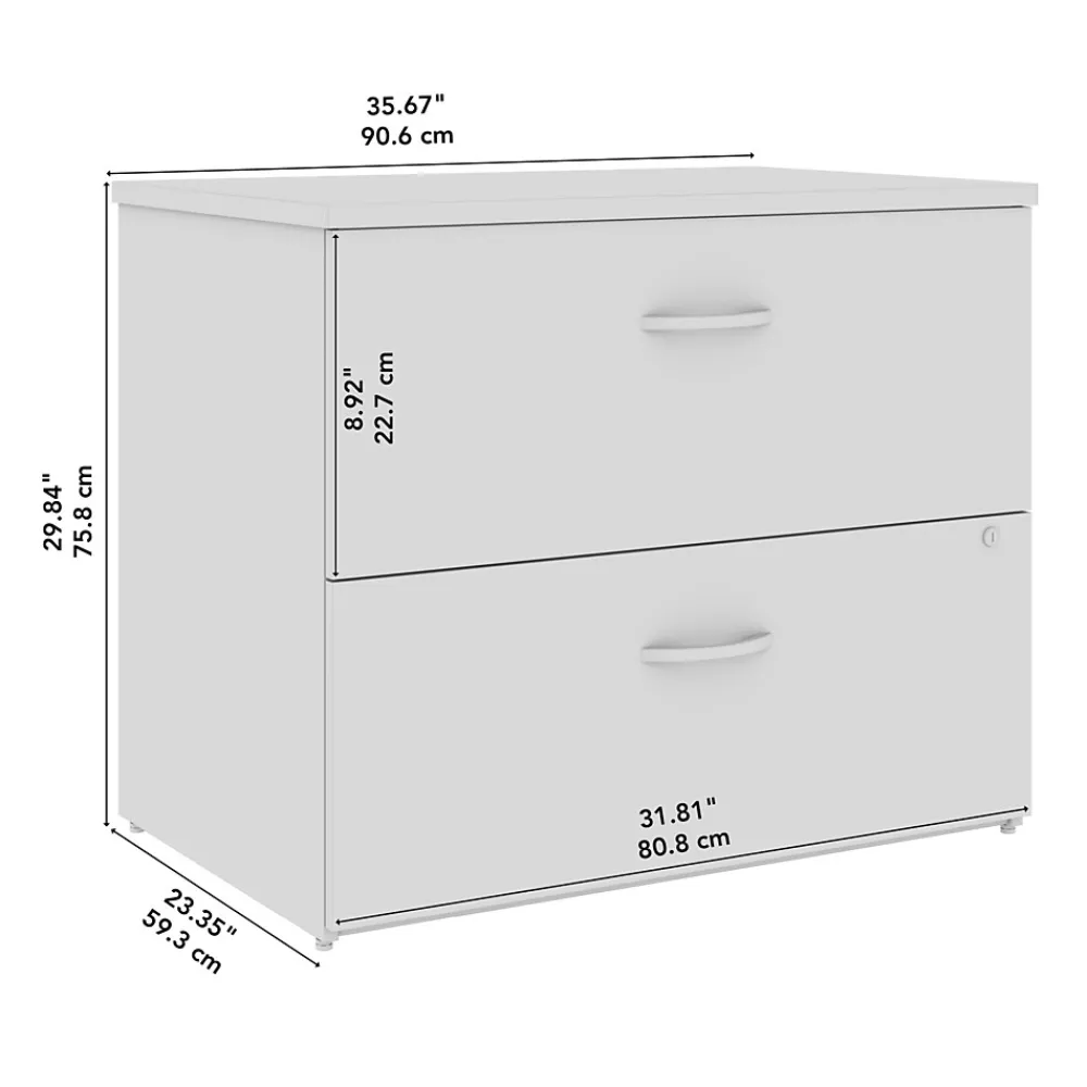 Keep your paperwork under control with the stylish and convenient Bush Business Furniture Studio C 2 Drawer Lateral File Cabinet. Featuring 2 spacious drawers, the filing cabinet ships fully assembled so you’ll be organizing your letter, legal and A4-size documents in no time. Drawers glide on smooth, full-extension ball bearing slides and can be locked to protect sensitive information. Eye-catching Brushed Nickel drawer pulls complement your choice of several contemporary or traditional finishes to make the Lateral File Cabinet as attractive as it is functional. Designed with your comfort in mind, the cabinet matches the height of Studio C desks (sold separately) to extend your workspace when placed side by side. This 2 drawer lateral filing cabinet is backed by a 10 Year Warranty and meets ANSI/BIFMA test standards for safety and performance. American made with U.S. and imported parts.