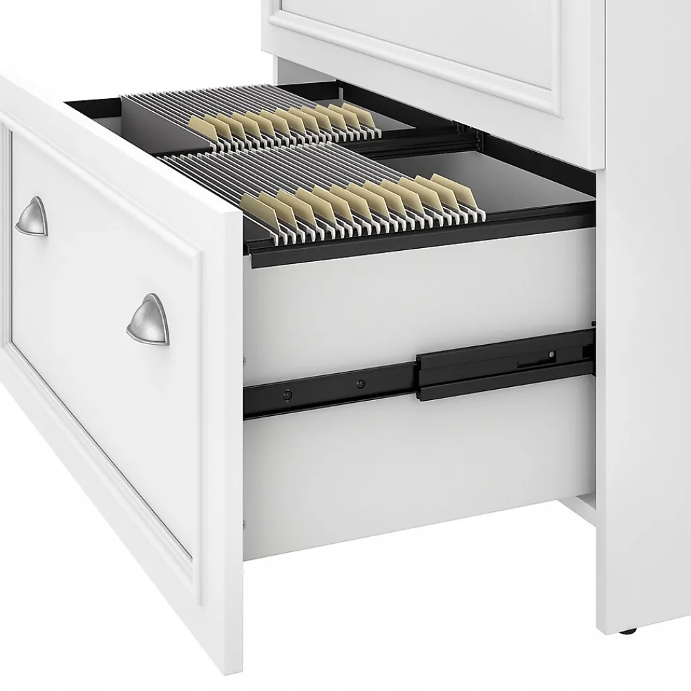 Bring a slice of modern farmhouse styling into your home office and get organized with the Bush Furniture Fairview two-drawer lateral file cabinet. Two large file drawers open on smooth full-extension ball bearing slides for an effortless reach to all your paperwork. The file cabinet’s drawers accommodate letter-, legal-, and A4-size documents and hold up to 50 lbs. of materials each. The two-drawer lateral file cabinet matches the height of the coordinating Fairview L-shaped desk with storage (sold separately) to offer an extended work surface when placed side by side. This farmhouse file cabinet is tested to meet ANSI/SOHO quality standards for safety and performance and is backed by the Bush Furniture 6-year manufacturer’s limited warranty.