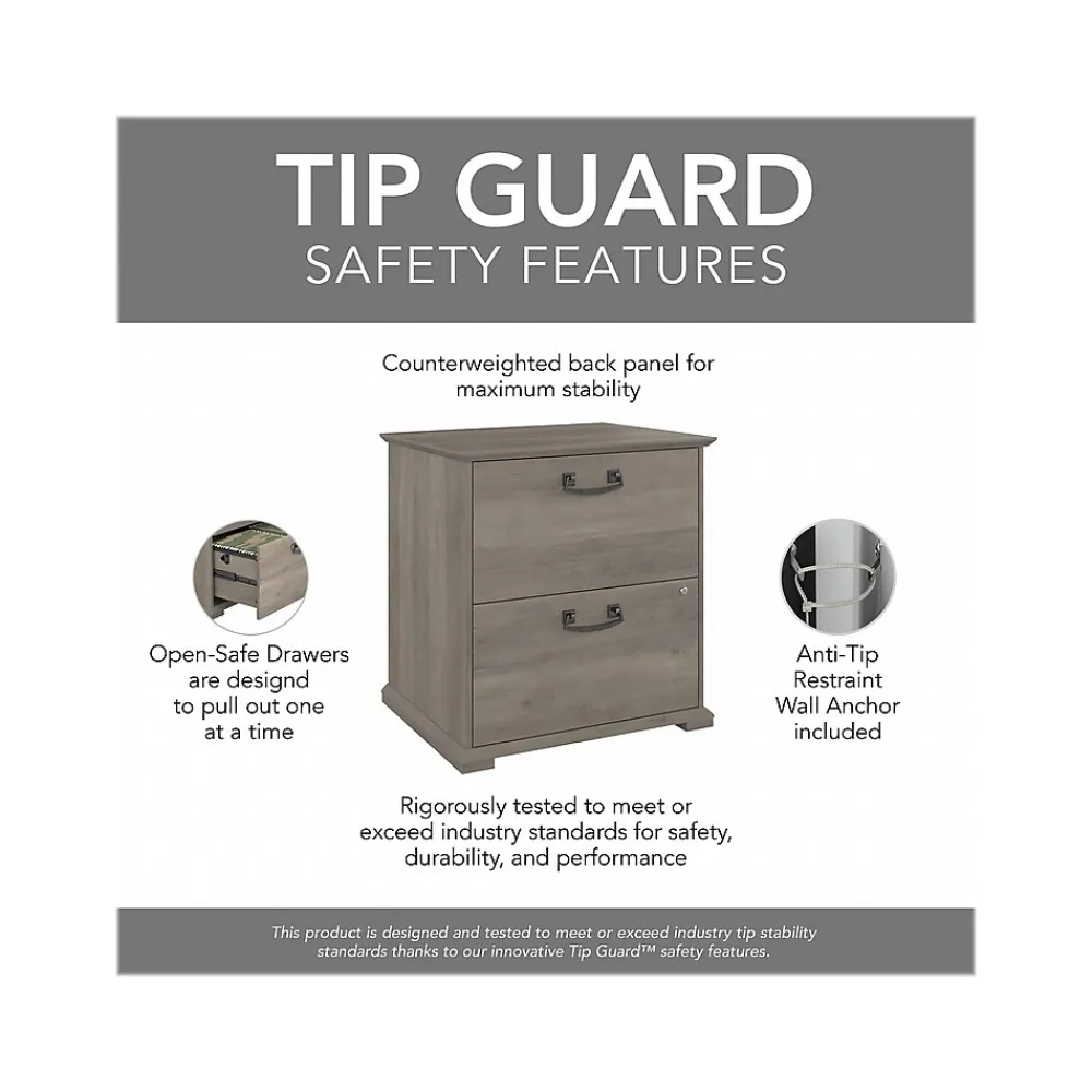 The Bush Furniture Homestead farmhouse-style lateral file cabinet offers a practical storage solution with an appealing modern farmhouse style. This filing cabinet utilizes Tip Guard safety features that include a stable design, a counterweighted back panel, wall attachment hardware, and safe-open drawers. Locking file cabinet’s drawers pull out one at a time for safe use and each support up to 50 lbs. Full-extension ball bearing slides provide easy-reach access to the letter-, legal-, and A4-size paperwork. A single lock secures both drawers for your privacy. Decorative trestle patterns, chamfered profile edges, and antique silver hardware give this cabinet a casual farmhouse style. This file cabinet has been tested to meet the ANSI/SOHO quality standards for safety and performance and is backed by a 1-year limited warranty. See the complete Homestead collection for more items.
