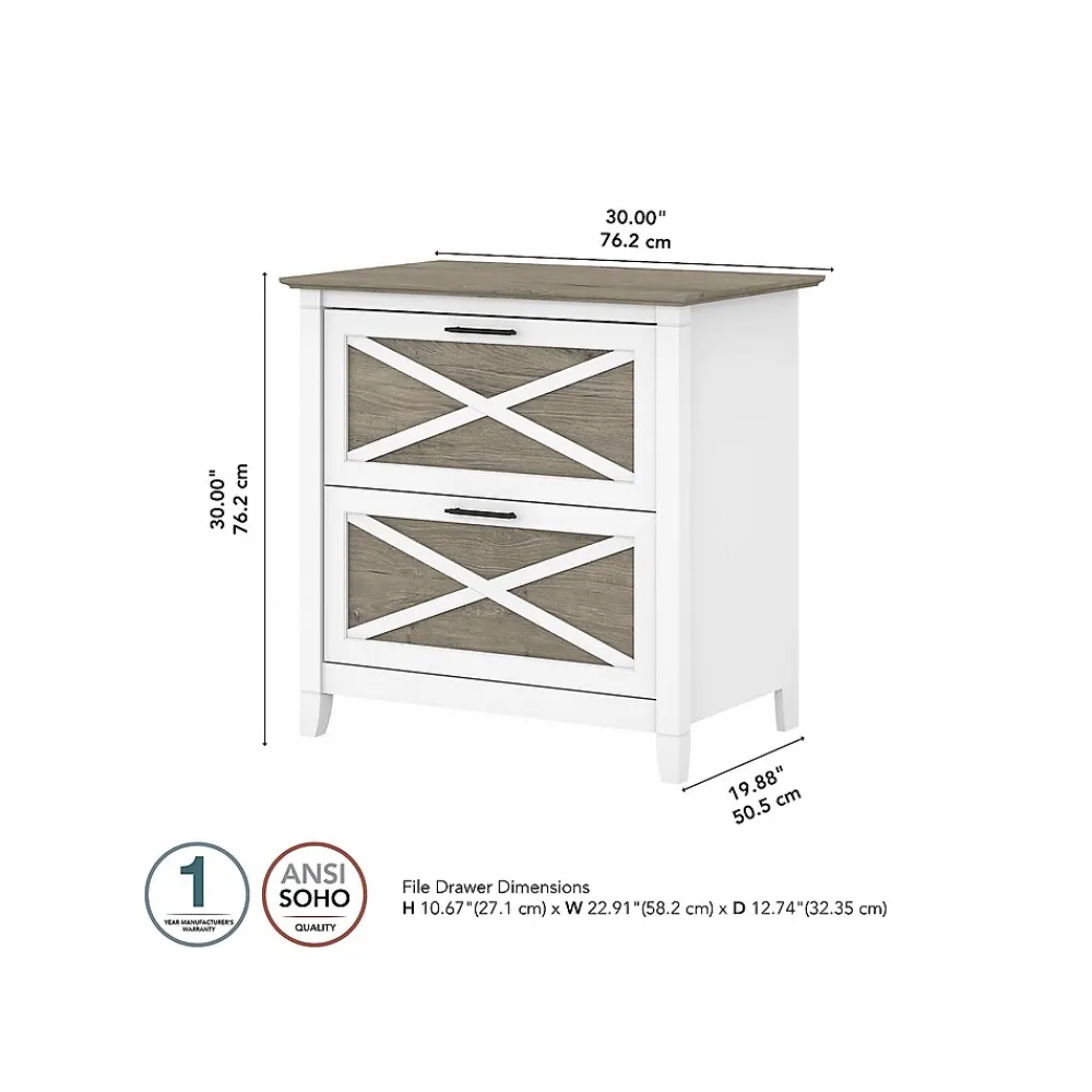 A natural fit for homes that embrace coastal and farmhouse decor, the Bush Furniture Key West two-drawer lateral file cabinet is perfect for organizing paperwork in virtually any room. Two file drawers open on smooth full-extension ball bearing slides for an easy reach to legal- and letter-size documents. Stylish X-shaped accents on the drawer panels create a relaxed style supported by a sturdy and attractive post leg design. This lateral file cabinet matches the height of any Bush Furniture Key West desk (sold separately) to create an extended work surface when placed side by side. The Bush Furniture Key West collection offers a wide variety of farmhouse furniture that makes building a complete home office or living room a breeze. This two-drawer file cabinet is tested to meet ANSI/SOHO quality standards for safety and performance and is backed by the Bush Furniture 1-year manufacturer limited warranty.