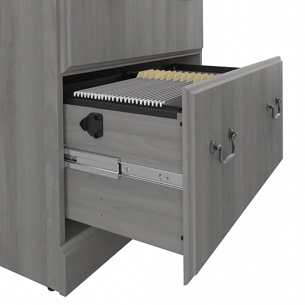 Enjoy the refined elegance of timeless traditional styling while keeping paperwork in order with the Bush Furniture Saratoga two-drawer lateral file cabinet. A perfect choice for virtually any office or private study, the file cabinet features two spacious file drawers that accept letter-, legal-, and A4-size documents. Drawers open on smooth full-extension ball bearing slides for an effortless reach to contents and are designed to extend one at a time for maximum stability. Each drawer holds up to 60 lbs. of materials, and the upper drawer can be locked to protect your personal information and other sensitive paperwork. The two-drawer file cabinet’s classic appearance is enhanced by decorative edge details and old-fashioned drop handle drawer pulls. This locking file cabinet has been tested to meet ANSI/BIFMA quality standards for safety and performance and is backed by a 10 Year Manufacturer’s Warranty.
