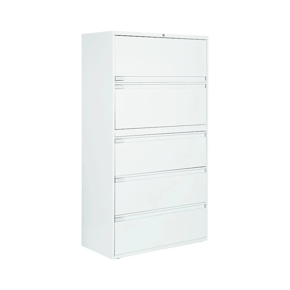 - Five-drawer lateral filing cabinet holds letter- or legal-size documents