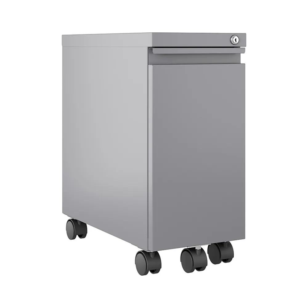 Compact alternative to standard pedestal files.The narrow design works great for smaller desks.Holds essential workstation supplies in the hidden box drawer.File drawer holds letter or legal size hanging file folders.Durable, fully assembled steel construction with non-porous surface is easy to clean. Lightweight design makes it easy to roll around.Includes a 5th swivel caster for stability eliminating the need for counterweights.Greenguard Gold certified for indoor air quality.Limited lifetime warranty.