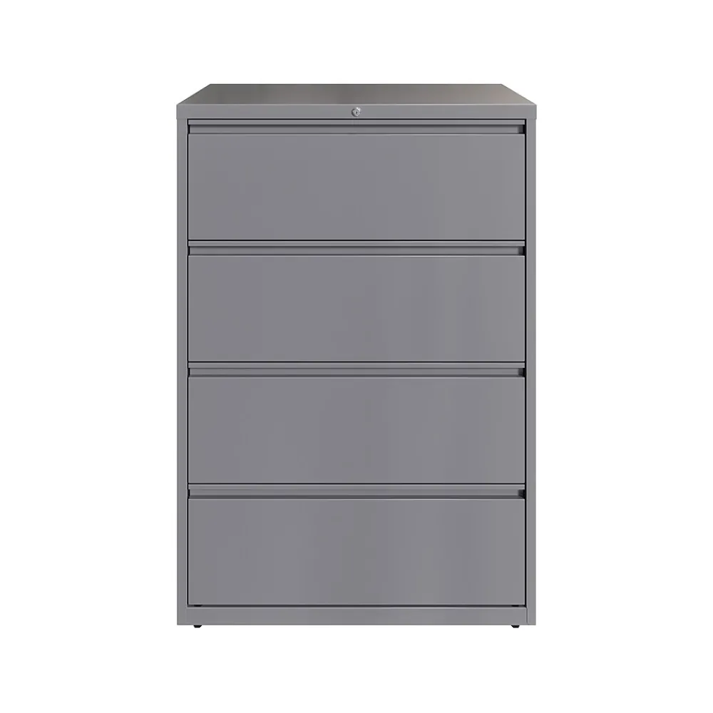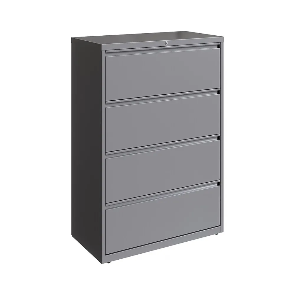 - Four-drawer lateral file cabinet holds letter-, legal-, or A4 size documents