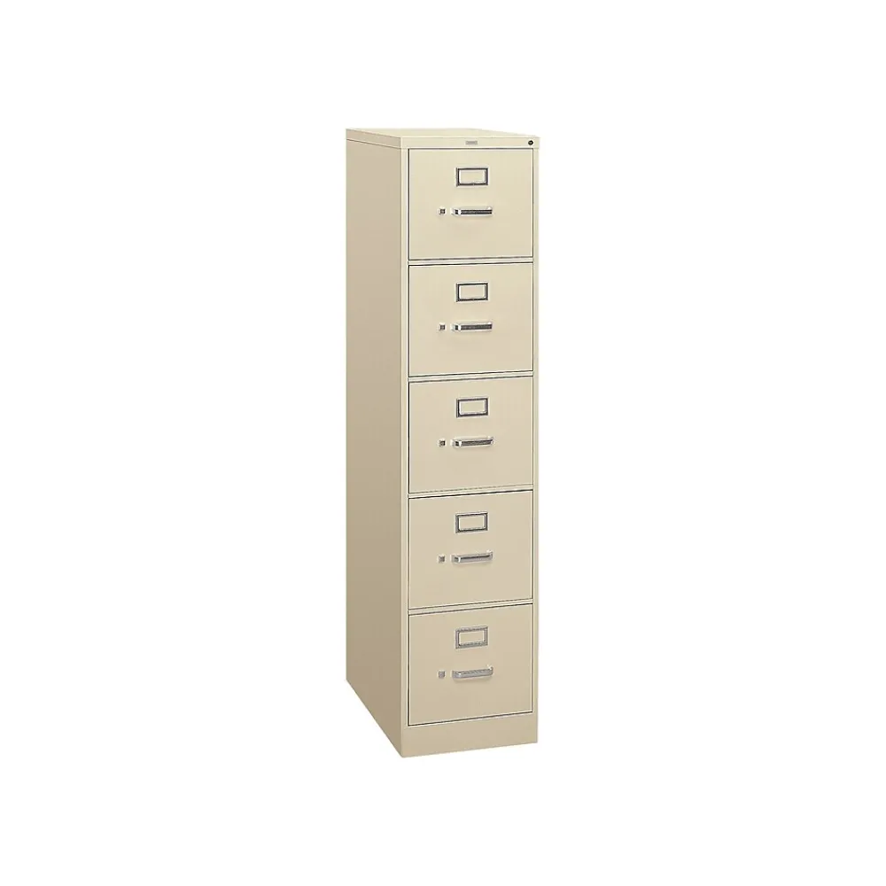 Keep legal-size paperwork at the ready inside this five-drawer vertical file cabinet. The slim width ensures a minimal footprint that fits narrow spaces, all while providing 25 filing inches per each high-sided drawer. Trust in the locking design for secure document storage, and change out the HON One Key core removable lock as needed for extra privacy and convenience. This HON 310 vertical file cabinet boasts a double-walled front kickplate that resists impact and all-welded metal construction for long-term durability and protection against brute-force intrusions.
