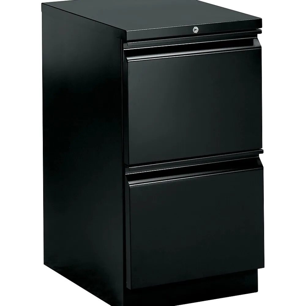 HON® Brigade™ 2 Drawer mobile pedestal file in black color measures 28″ x 15″ x 19 7/8″ and ideal for letter-size files. Pedestal file features counterweight anti-tip mechanism with steel ball bearing suspension for easy sliding.