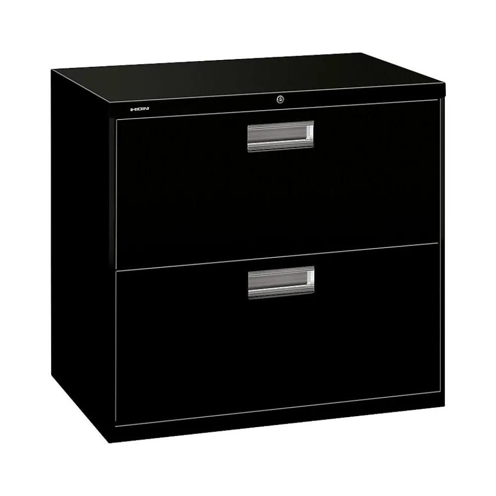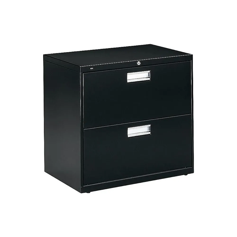 Keep paperwork organized with this HON 600 series two-drawer lateral file cabinet. Its durable steel frame can stand up to everyday use, and the two drawers operate smoothly and quietly thanks to ball bearing suspensions, while a mechanical interlock prevents multiple drawers from opening at the same time. With a two-sided lock mechanism and removable lock core, this HON Brigade 600 series lateral file keeps sensitive documents securely tucked away.