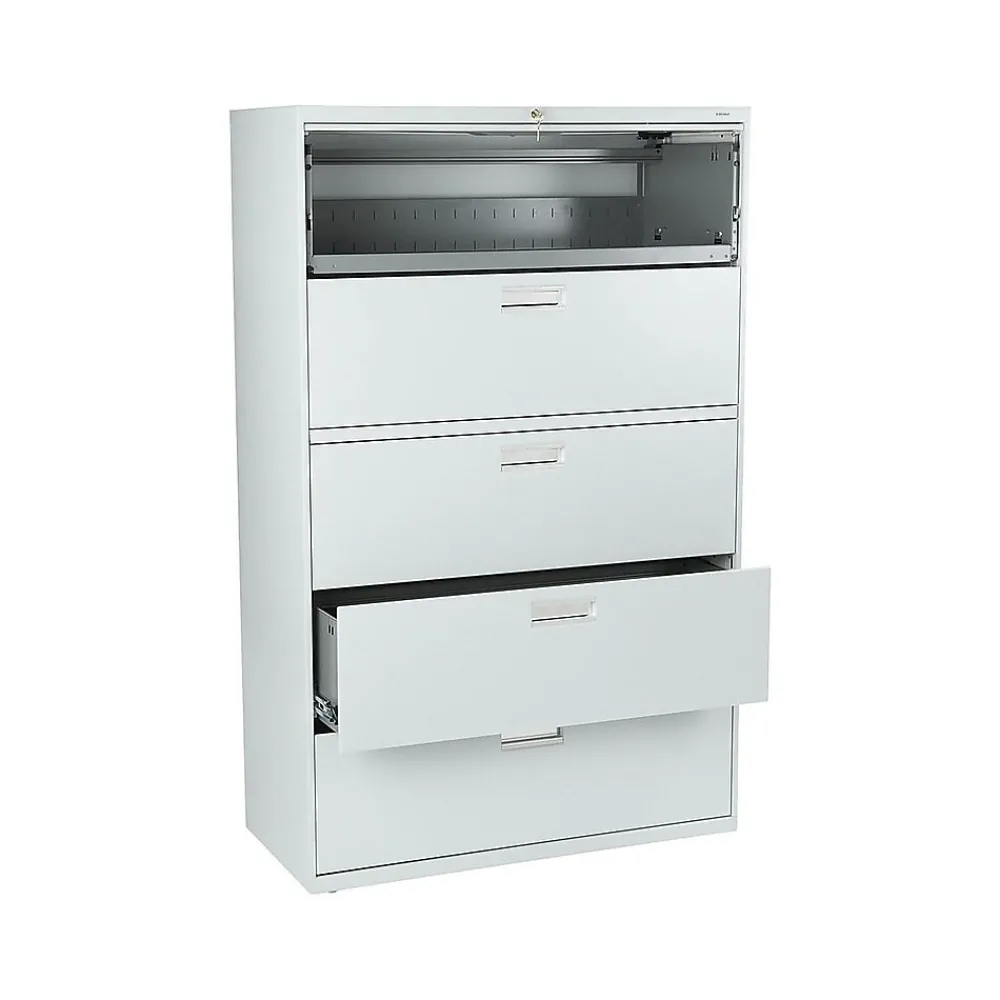 Organize important files and documents with this five-drawer lateral file cabinet. The integrated two-sided locking mechanism prevents unauthorized entry, and the built-in counterweight prevents the cabinet from tipping forward when the drawers are fully extended. This HON Brigade 600 lateral file has heavy-duty steel ball bearings that makes the drawers easy to open and close, and the all-welded case helps the cabinet stand up to commercial environments.
