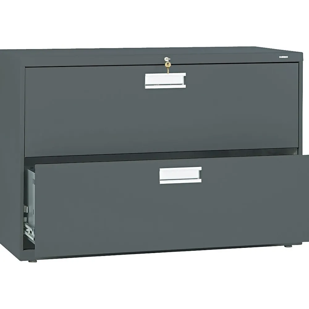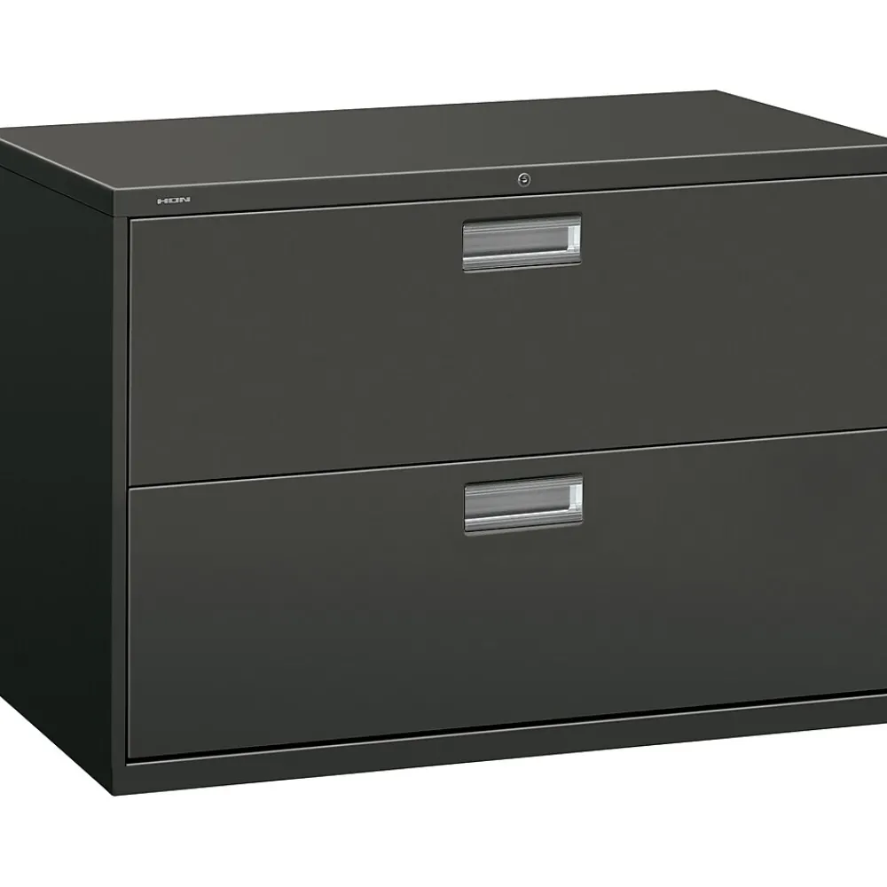 HON® Brigade™ 600 Series Lateral file cabinet in charcoal color is constructed from 30 percent post consumer materials. Lateral file cabinet measuring 28 3/8″ x 42″ x 19 1/4″ features two drawers for storing the files up to 3.5 cu. ft.