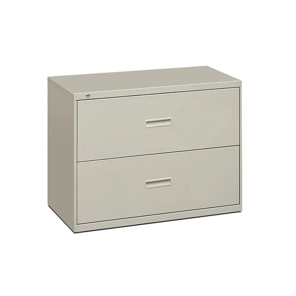 This two-drawer, 36″W model has a tamper-resistant enclosed base. Cabinet accepts letter or legal hanging file folders. Molded polymer handle is standard. Finish color is Light Gray.