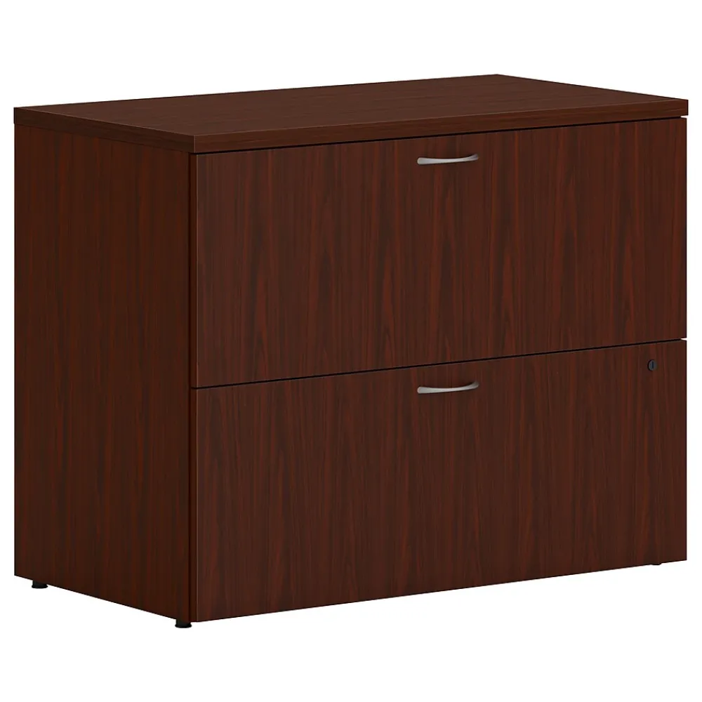 - Two-drawer lateral file cabinet holds letter- or legal-size documents