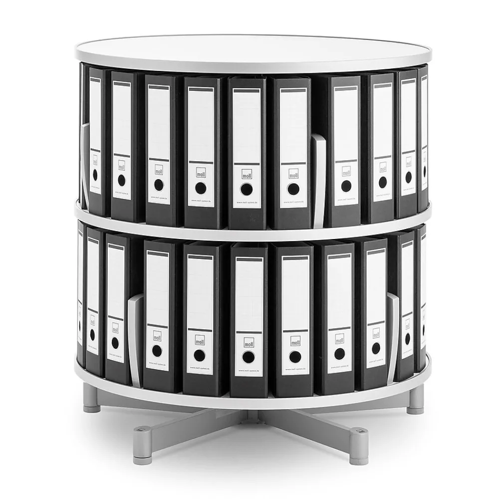 Moll® Two-tier binder and file storage carousel features 32″ diameter unit which offers abundant storage in a small area. Carousel shelf is protected with a hard rubber edge banding. Also seen in picture Top storage carousel (Item 277944) and Caster base (Item 277729) sold separately