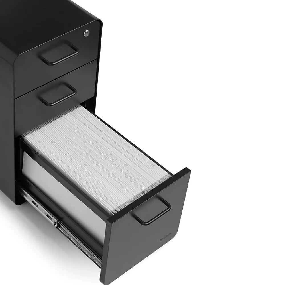 - Slim Stow File Cabinet with durable powder-coated steel construction stands up to movers and shakers