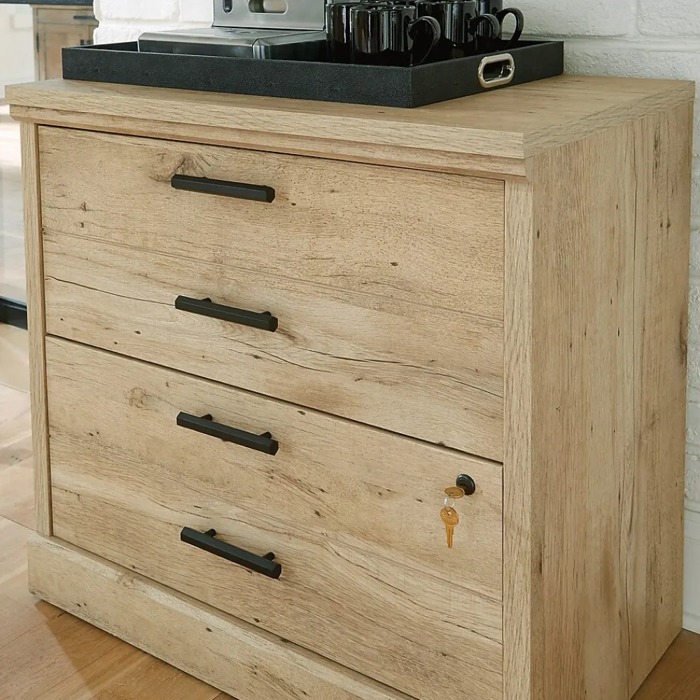 Your papers deserve more than being shoved in a drawer only to be forgotten about or disappear when you need them most. The Mason Peak lateral file cabinet will make sure you never go scrambling for that missing document ever again. With drawers that fully extend and hold letter, legal or European size hanging files, all your important documents are readily available at your fingertips. Your files will be secure with the drawer key locks on this wood lateral file cabinet. Safety is on our minds, and the interlocking safety mechanism of this 2 drawer lateral file cabinet allows only one drawer to open at a time. Your time is precious. That’s why this wood lateral file cabinet comes fully assembled with minimal hardware attachment required. Commercial filing cabinets are a centerpiece in the best offices, and this file cabinet is finished on all sides for a polished look from every angle. Finished in a light Prime Oak, commercial office storage has never looked so good.